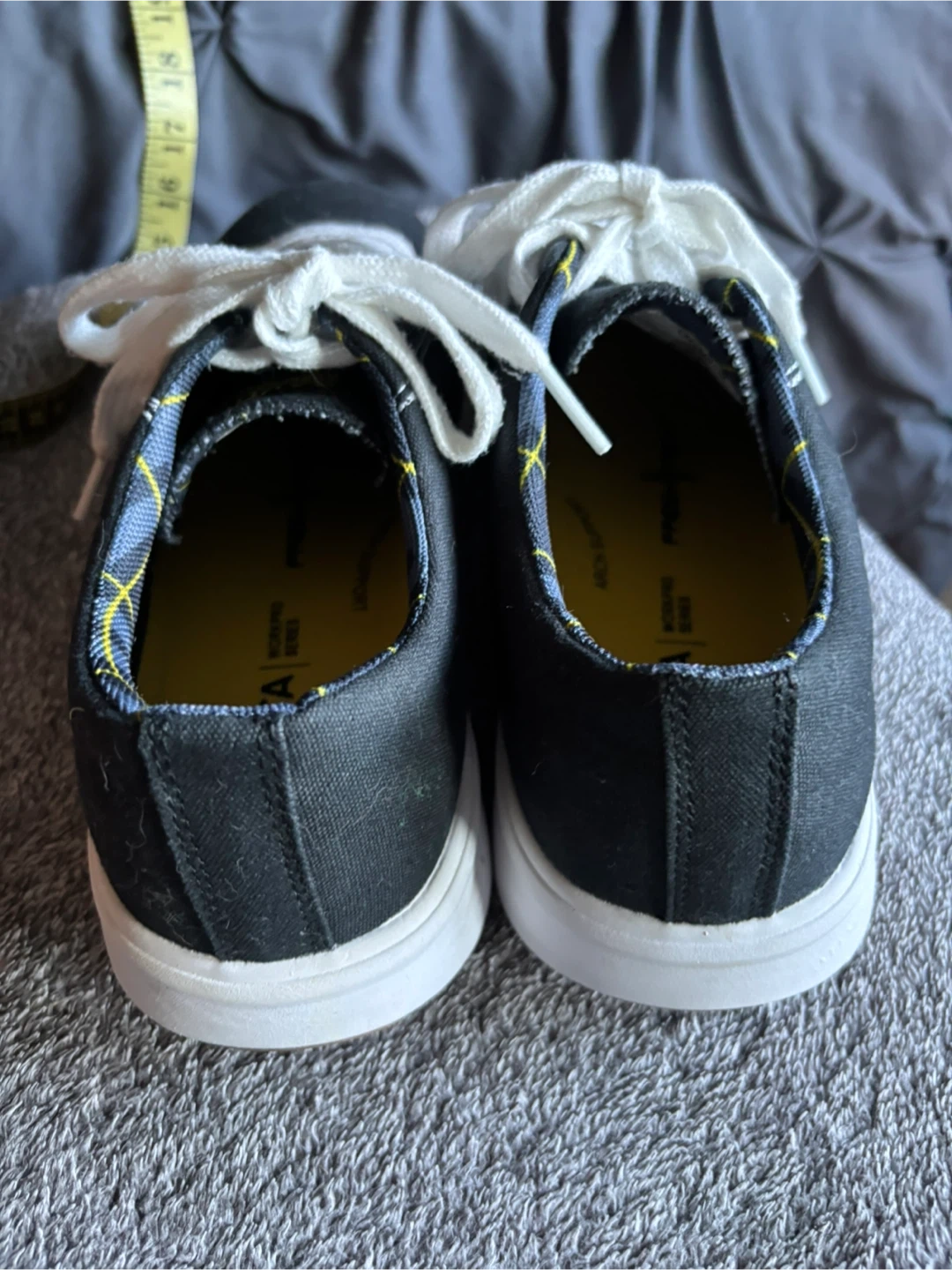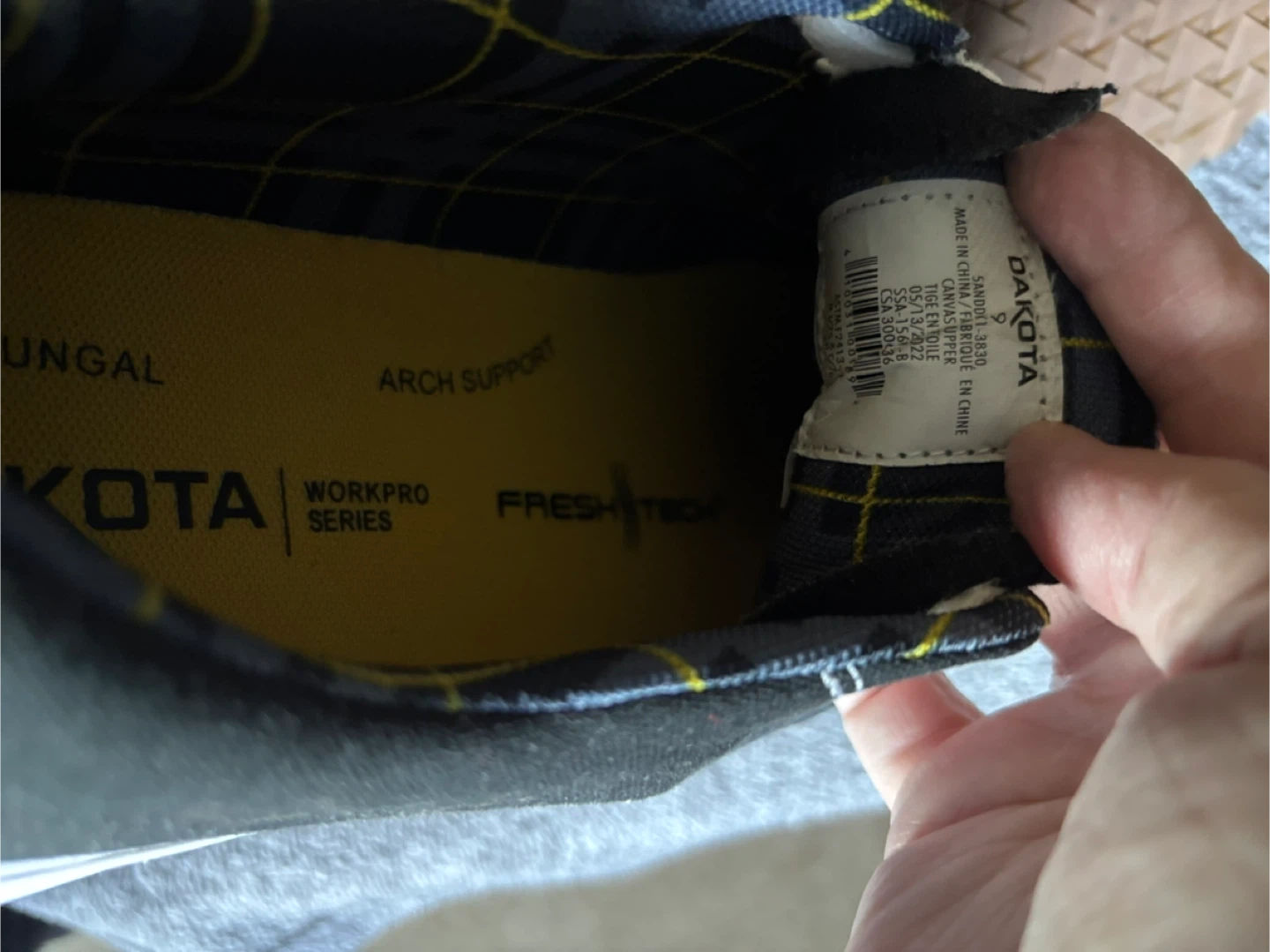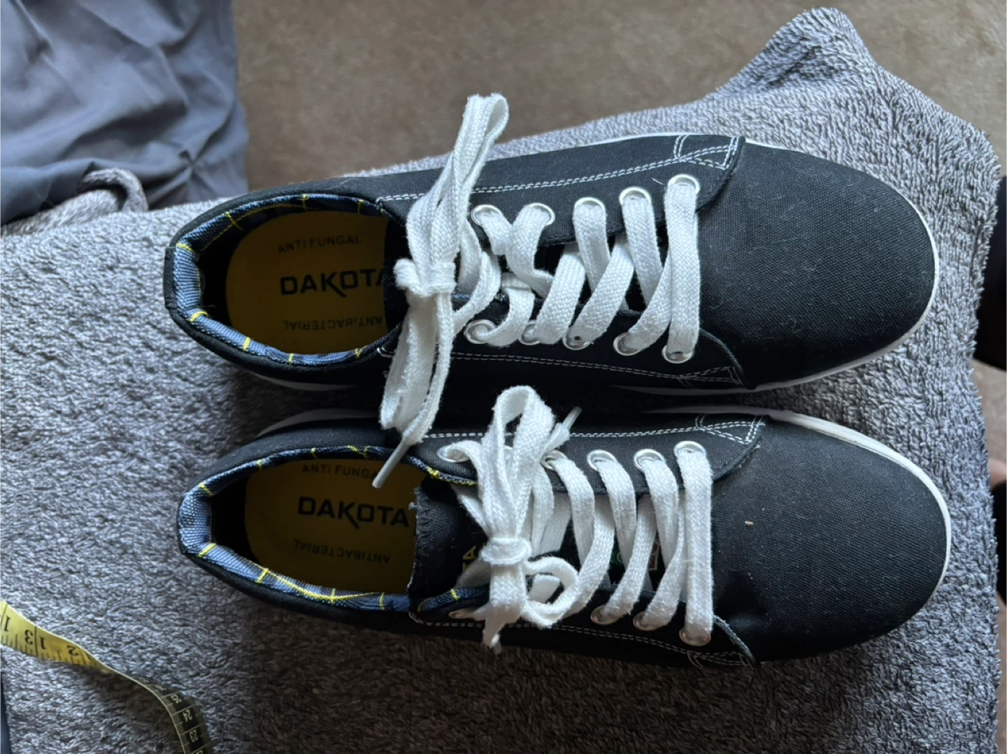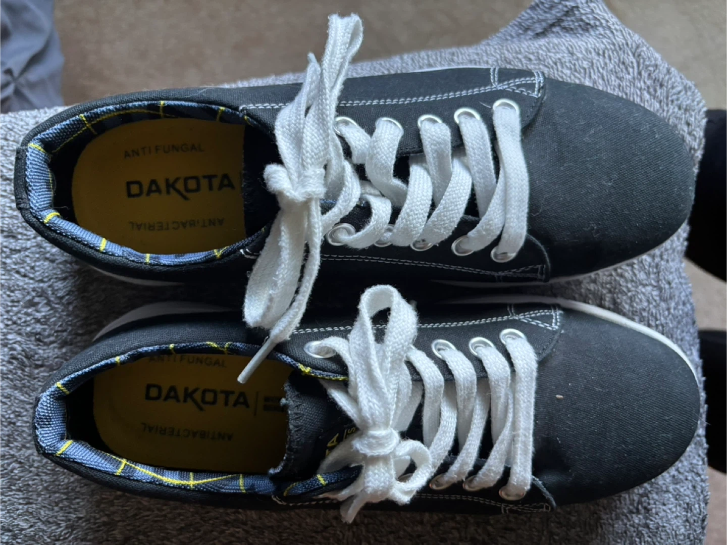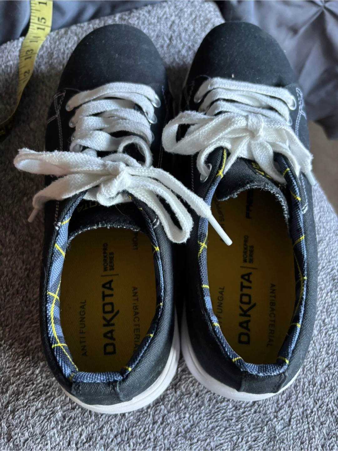 Selling a pair of Dakota black canvas sneakers. They feature white laces and white soles. The inner lining is anti-fungal and antibacterial for extra comfort and hygiene CANVAS UPPER • DRI-TECH BREATHABLE AND MOISTURE-WICKING LINING • FRESHTECH®: Odour protection technology for all day freshness • PADDED COLLAR • ELASTIC GUSSETS • PU MIDSOLE • SAFETY FIRST: CSA Grade 1 steel toe, steel plate. Electric shock resistant • RUBBER OUTSOLE • LACE-UP STYLE