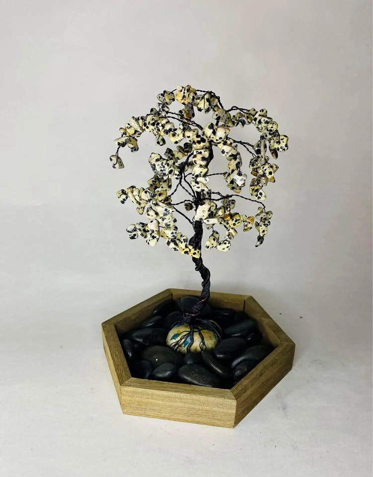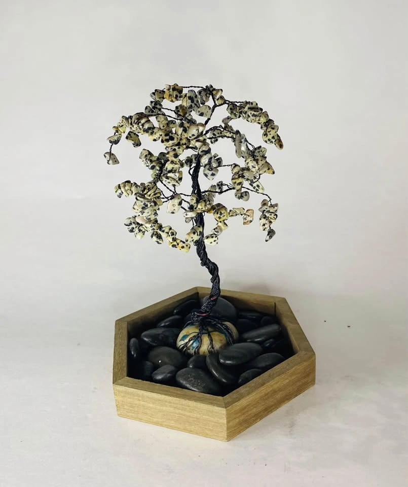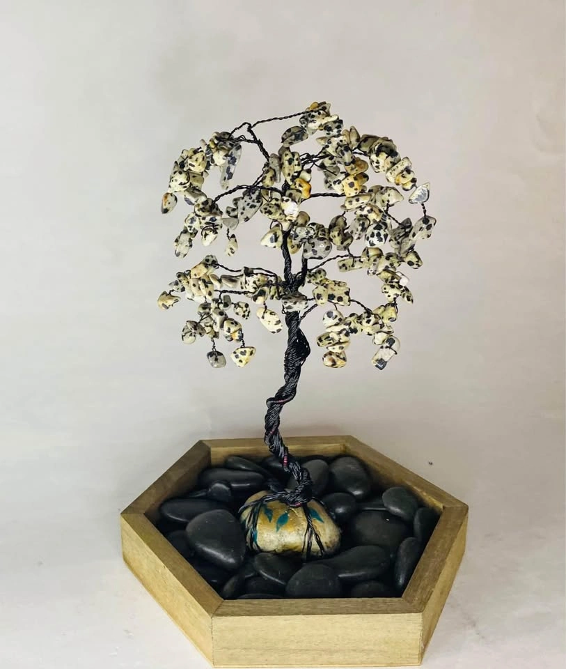 65🐾 Dalmatian Jasper “Tree of Playful Positivity” 🐾 ✨ Joy • Balance • Grounding • Emotional Healing 📏 Approx. Size: 7” tall × 6” wide 🪵 Materials: Handcrafted with black copper wire, set on a hand-painted stone base 💰 Price: $75 Bring cheerful, grounding energy into your space with this handcrafted Dalmatian Jasper gemstone tree. Known as The Stone of Playful Positivity, Dalmatian Jasper radiates lighthearted joy and reminds us to embrace life’s simple pleasures with optimism and gratitude. 🌸 Best for: • Brightening your home or workspace 🌞 • Encouraging positivity and emotional balance • Gifting to anyone who needs a little extra joy! 💎 Metaphysical Highlights: Dalmatian Jasper — Promotes happiness, grounding, and balance. • Encourages playfulness and a positive outlook • Releases negative emotions and old patterns • Strengthens loyalty, determination, and self-belief • Inspires emotional healing and spiritual connection Every branch is lovingly shaped by hand, featuring 200–250 genuine Dalmatian Jasper gemstones, making each tree truly one of a kind. A perfect statement piece for your home or a heartfelt gift for anyone seeking joy, grounding, and emotional renewal. 🐾💫