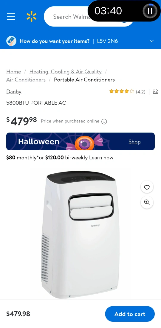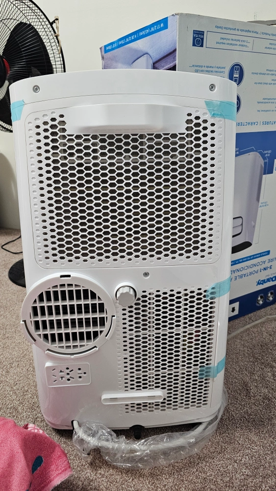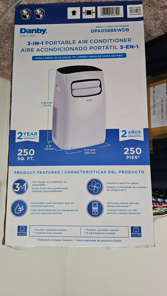 60Selling a brand new Danby 3-in-1 portable air conditioner! This model is the DPA058B6WDB. It cools areas up to 250 sq ft. 10000 BTU (SACC 5800 BTU) Product features include: - 3-in-1 design: Air conditioner, fan, and dehumidifier - Powerful 3 cool/fan speeds - Soft touch controls with LED display and remote - Dehumidifier mode with direct drain for continuous operation - Requires ventilation exterior - Outdoor ventilation required