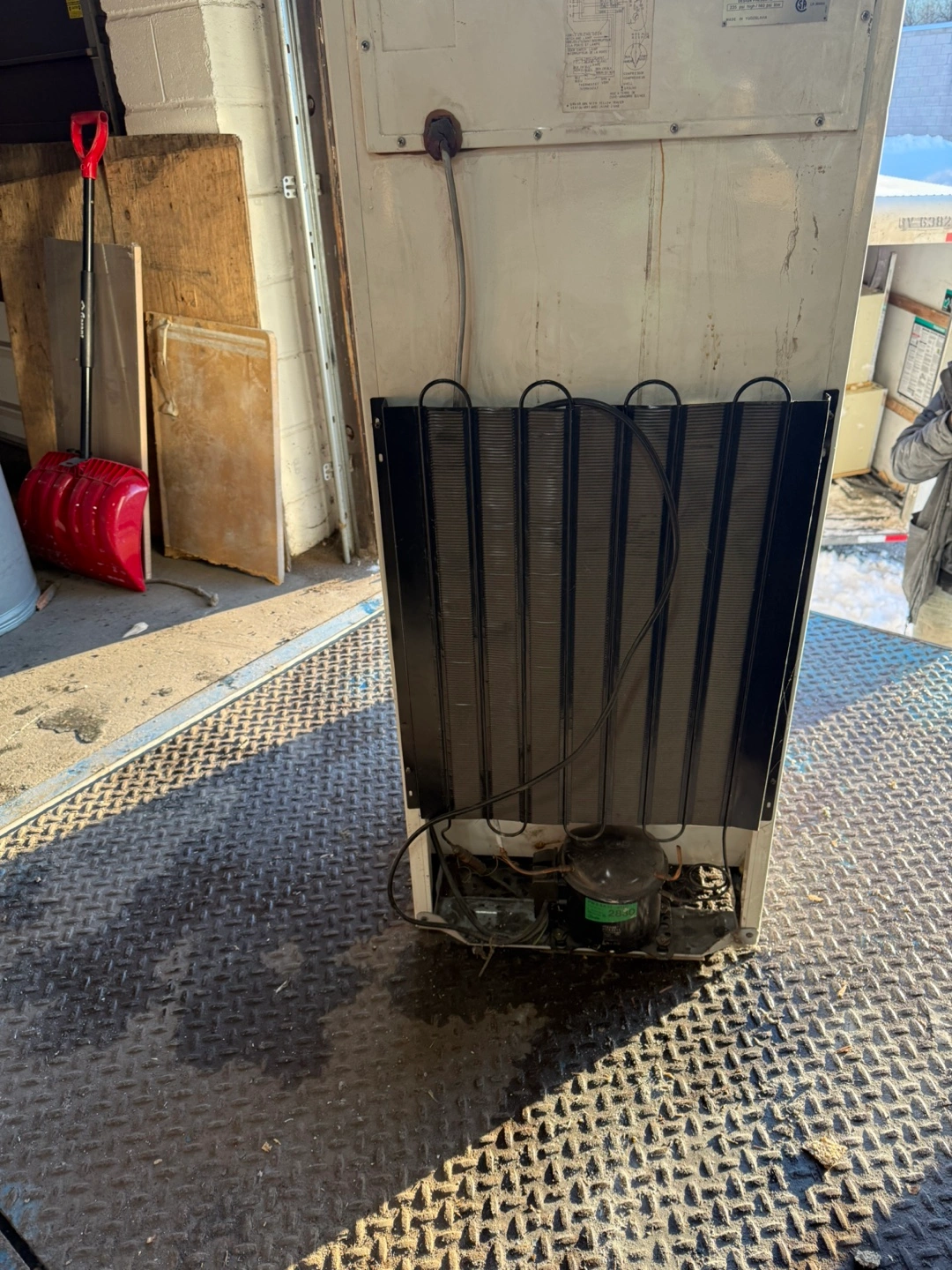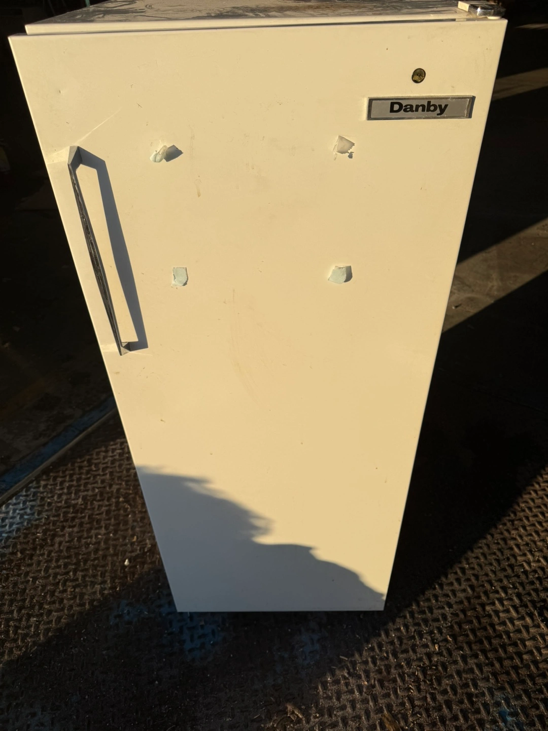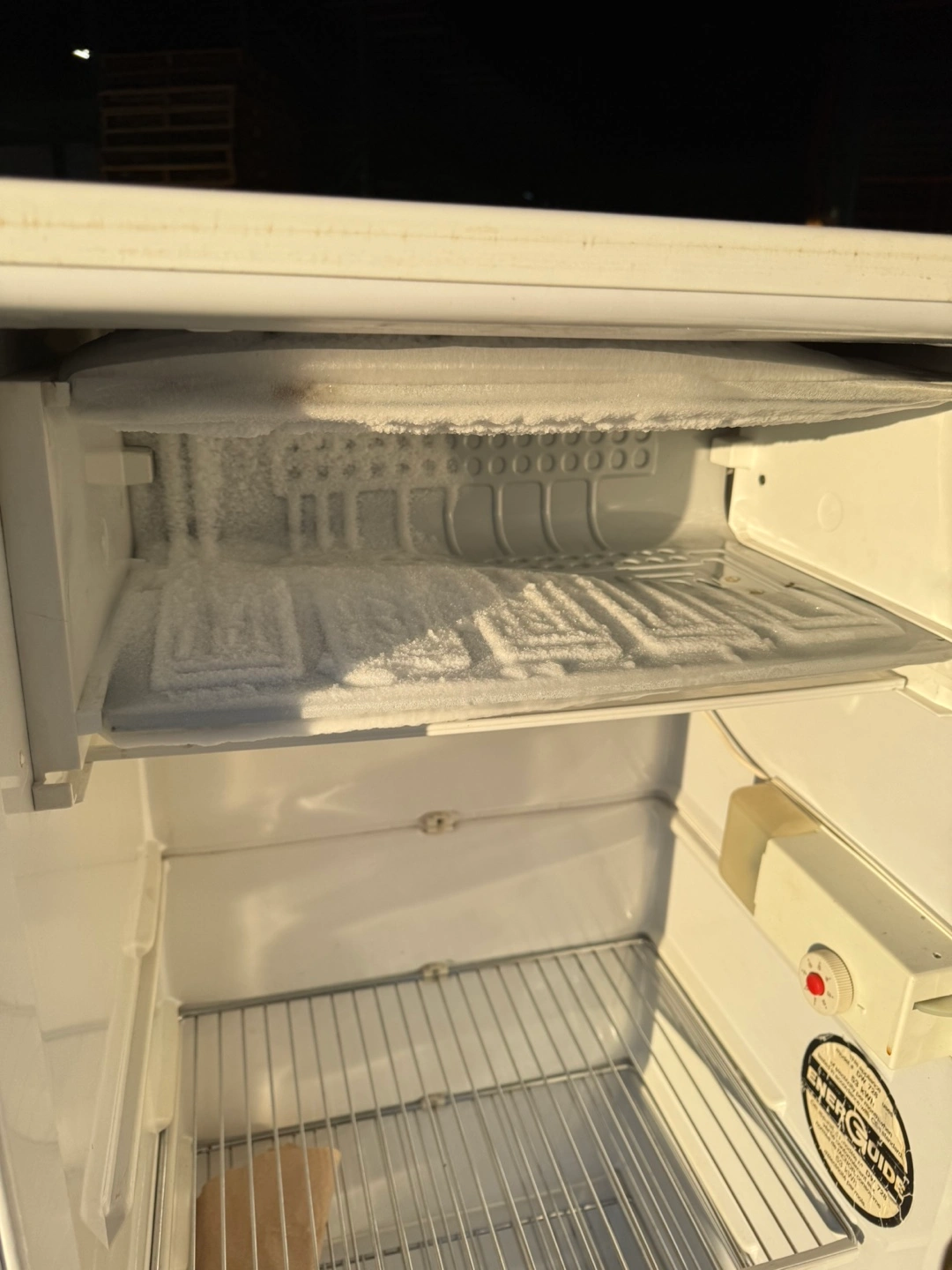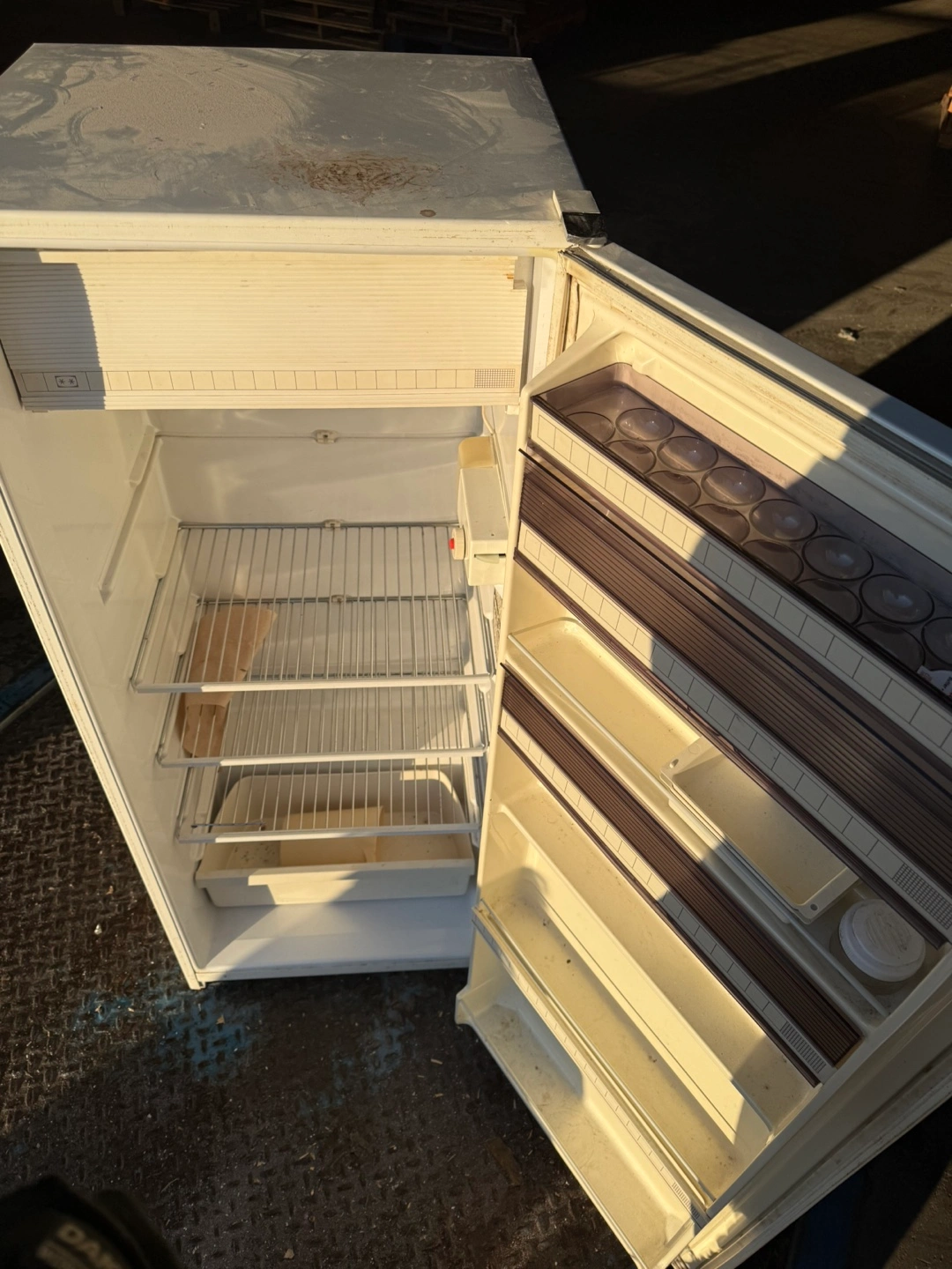 62Danby compact refrigerator. Off-white colour. Includes shelves and crisper. Ideal for a small space or garage.