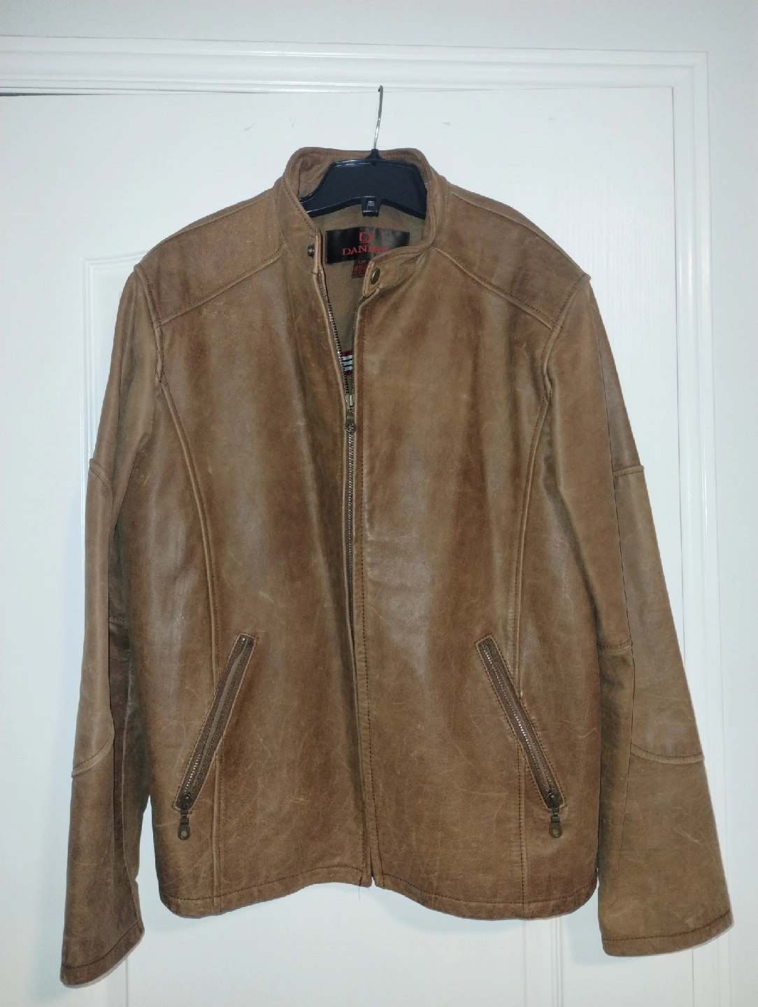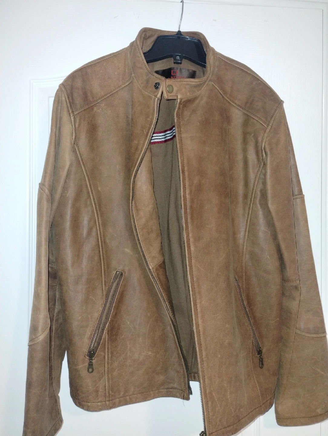 10Selling a Daniel Cremieux brown leather jacket. The outer shell is genuine leather, and the lining is 50% cotton and 50% acetate. It's a stylish and comfortable jacket, perfect for adding a touch of class to any outfit
