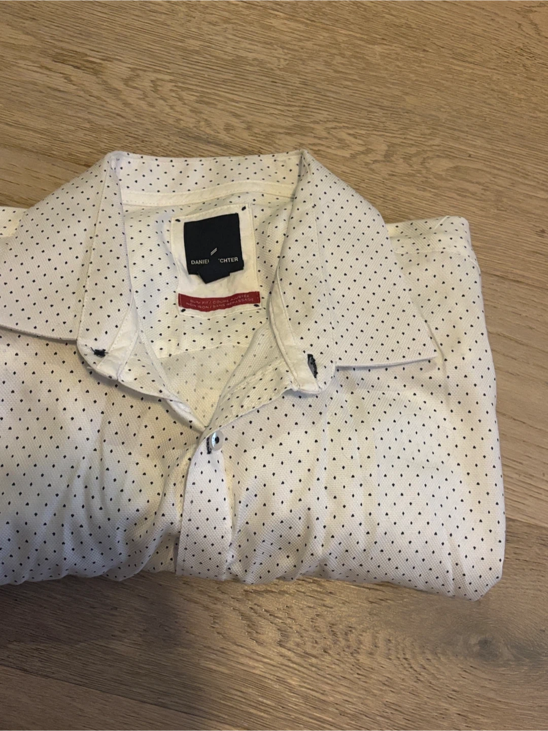 20Here's a gently used Daniel Hechter dress shirt in size XL. It features a subtle dot pattern on a white background. Perfect for dressing up or down!