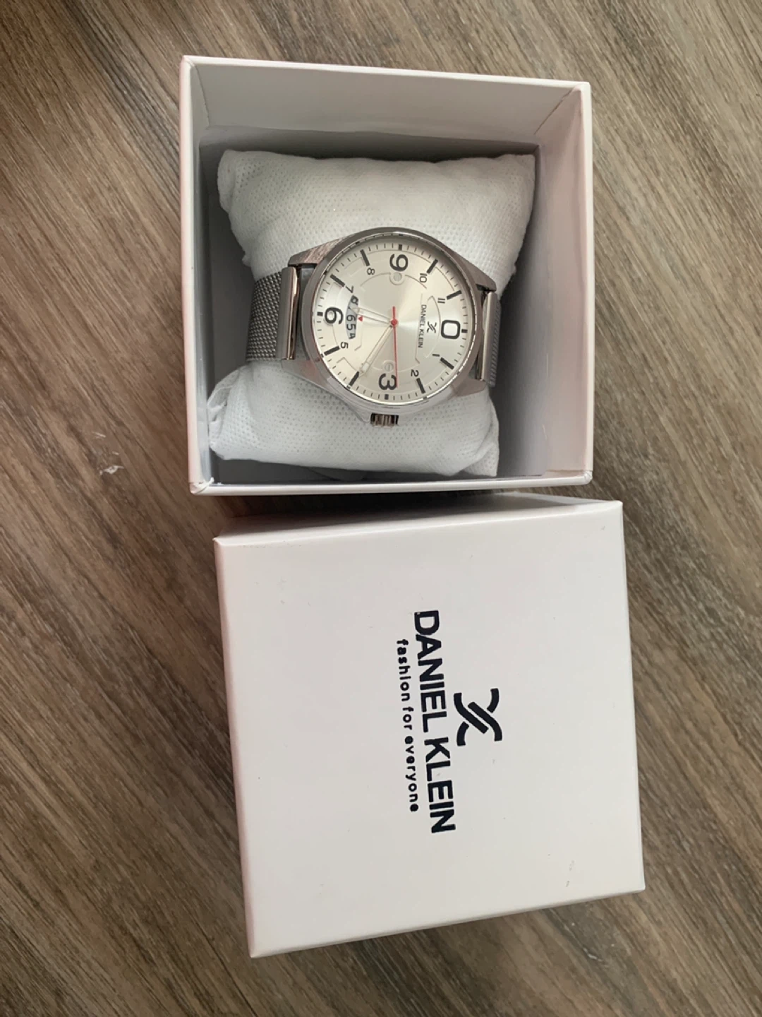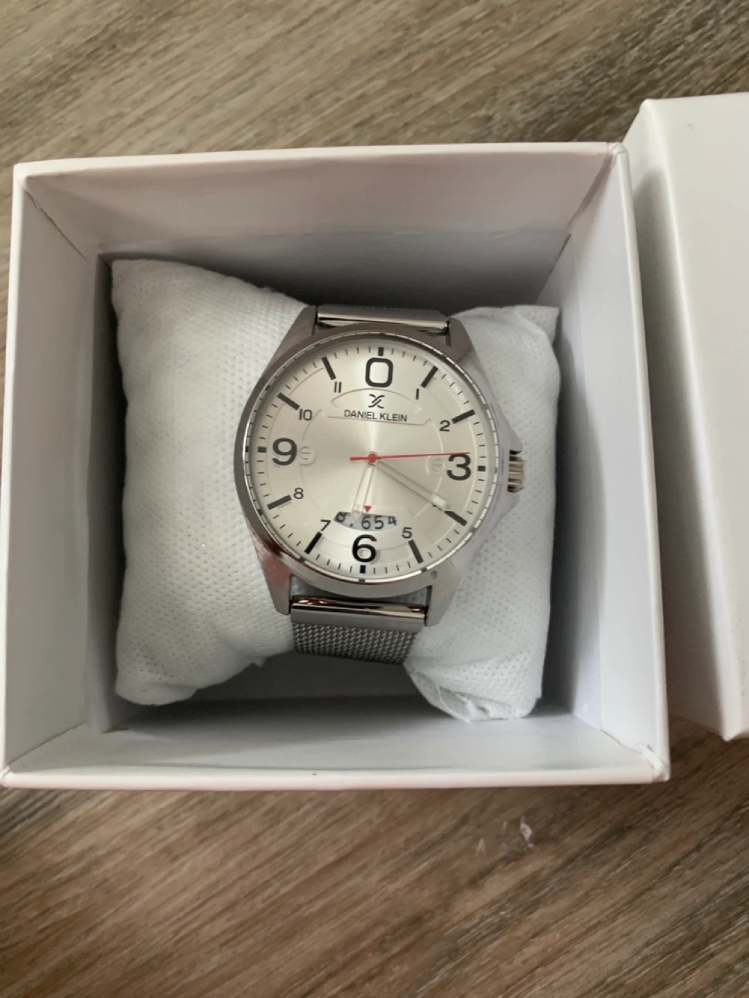 Selling a Daniel Klein men's watch. It comes with the original box and pillow insert. The watch features a silver-tone case and mesh band, with a white dial and easy-to-read numerals. A stylish accessory for any occasion!
