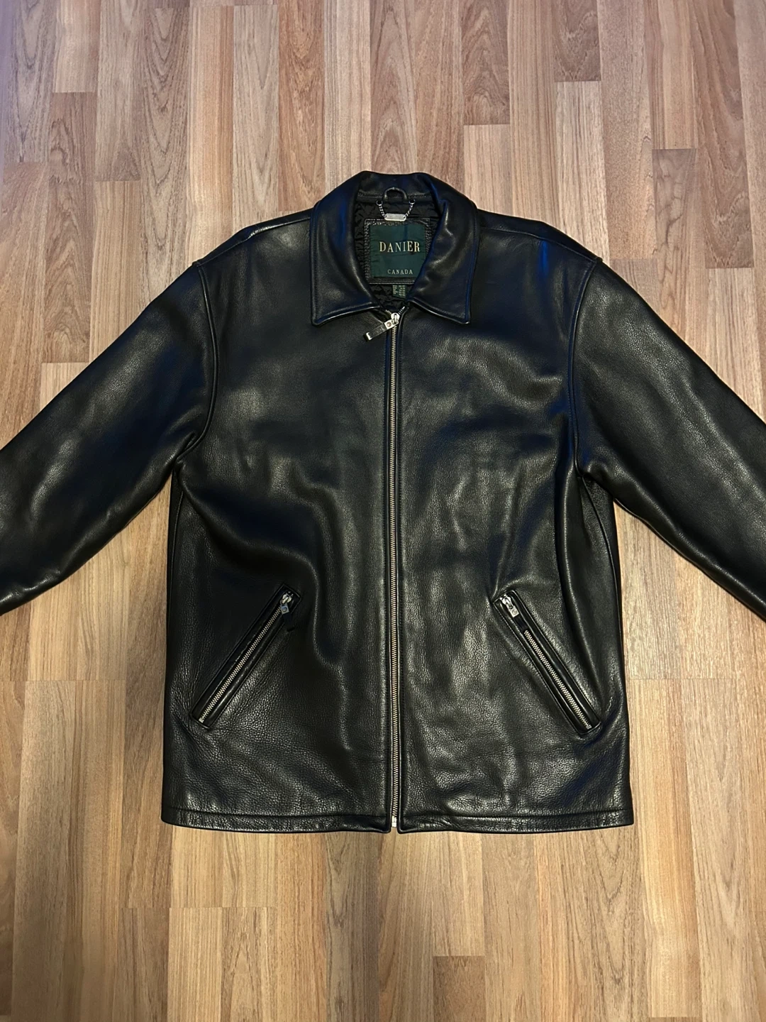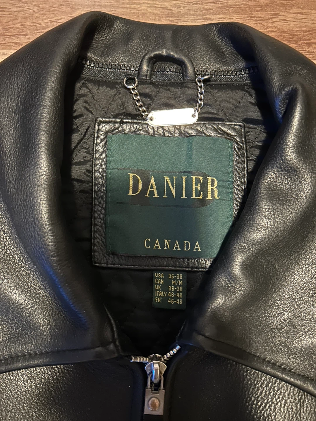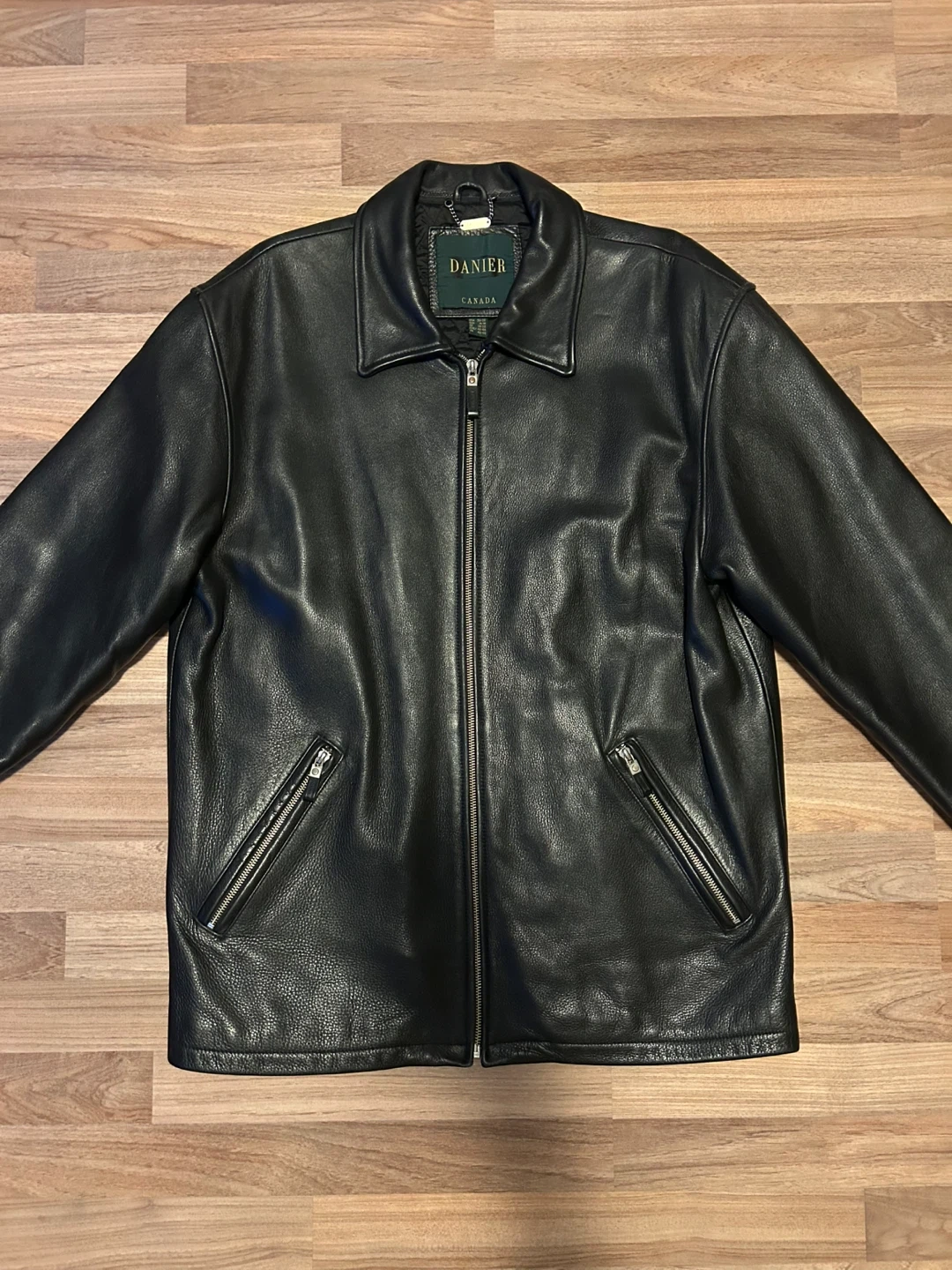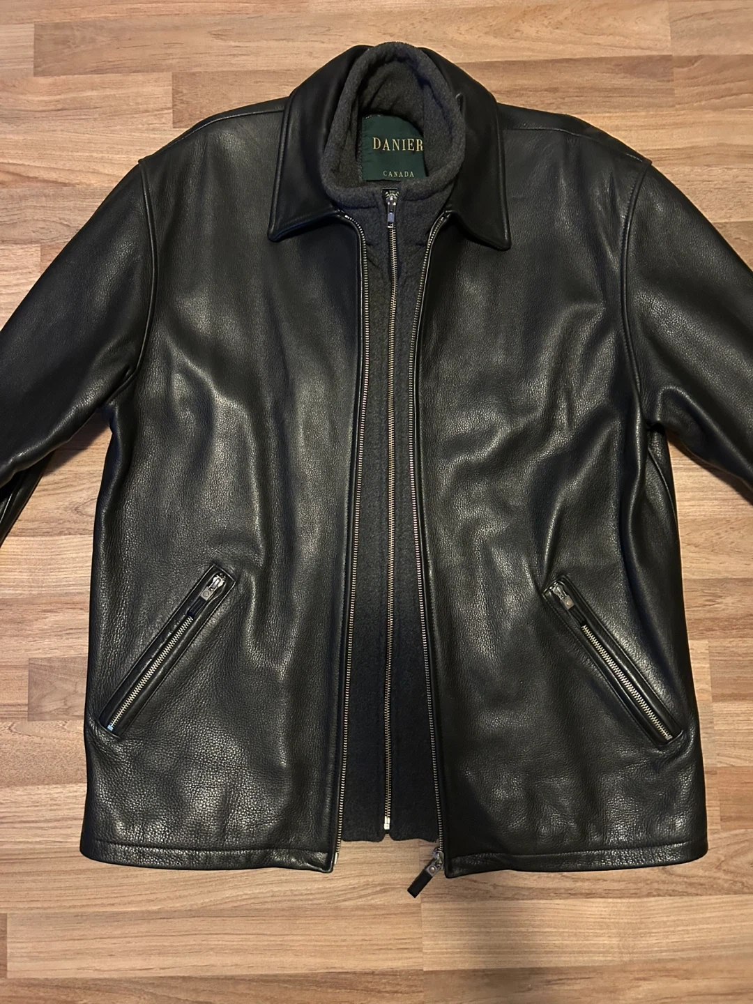 10Classic black leather jacket from Danier! It's in great condition and ready for a new home. Perfect for adding a touch of style to any outfit. Comes with two removable inner linings. Gray or black.