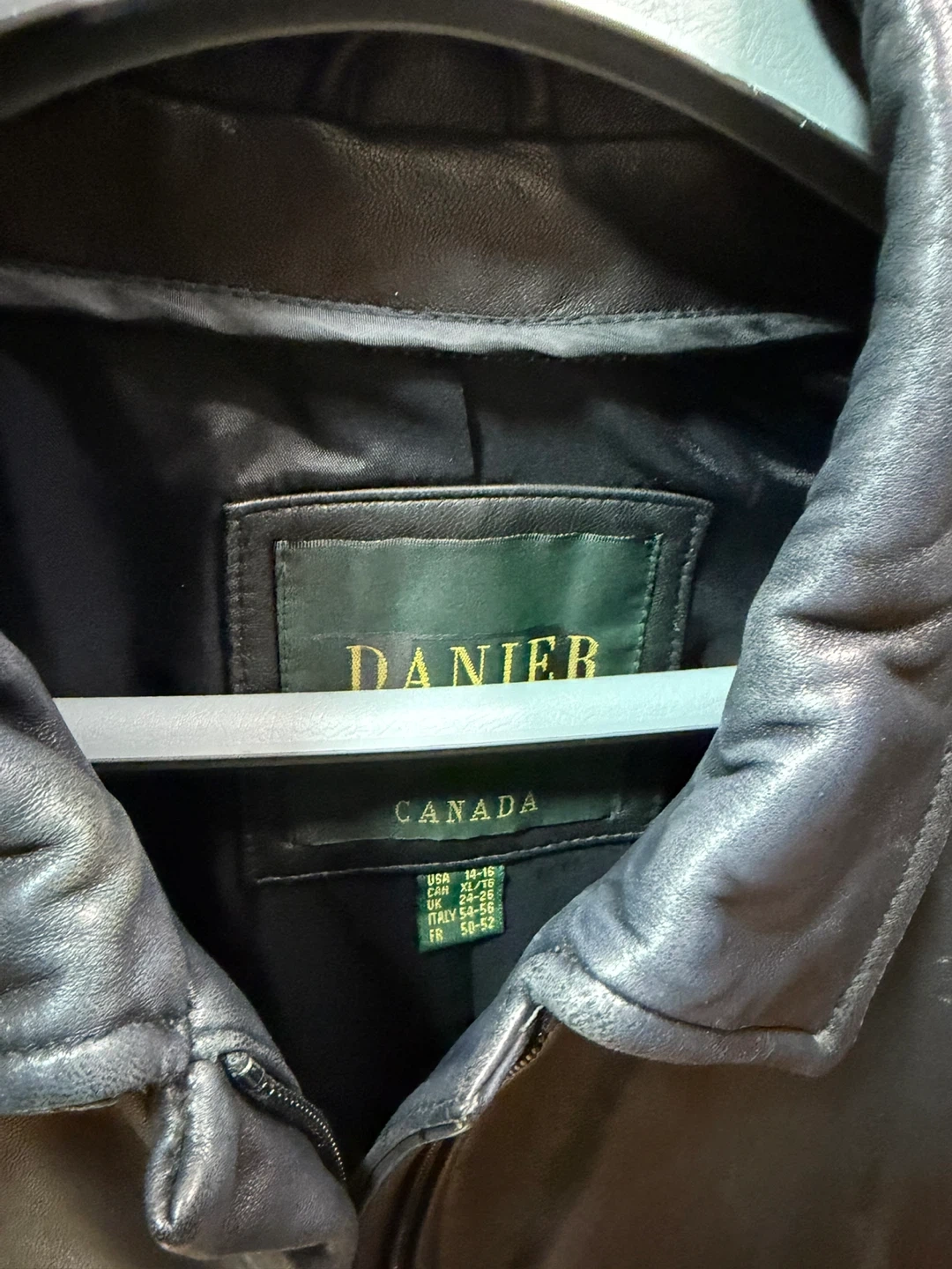 28Classic black leather jacket from Danier, perfect for adding a touch of style to any outfit! It's in great condition and ready for a new home. The size is XL/TG.
