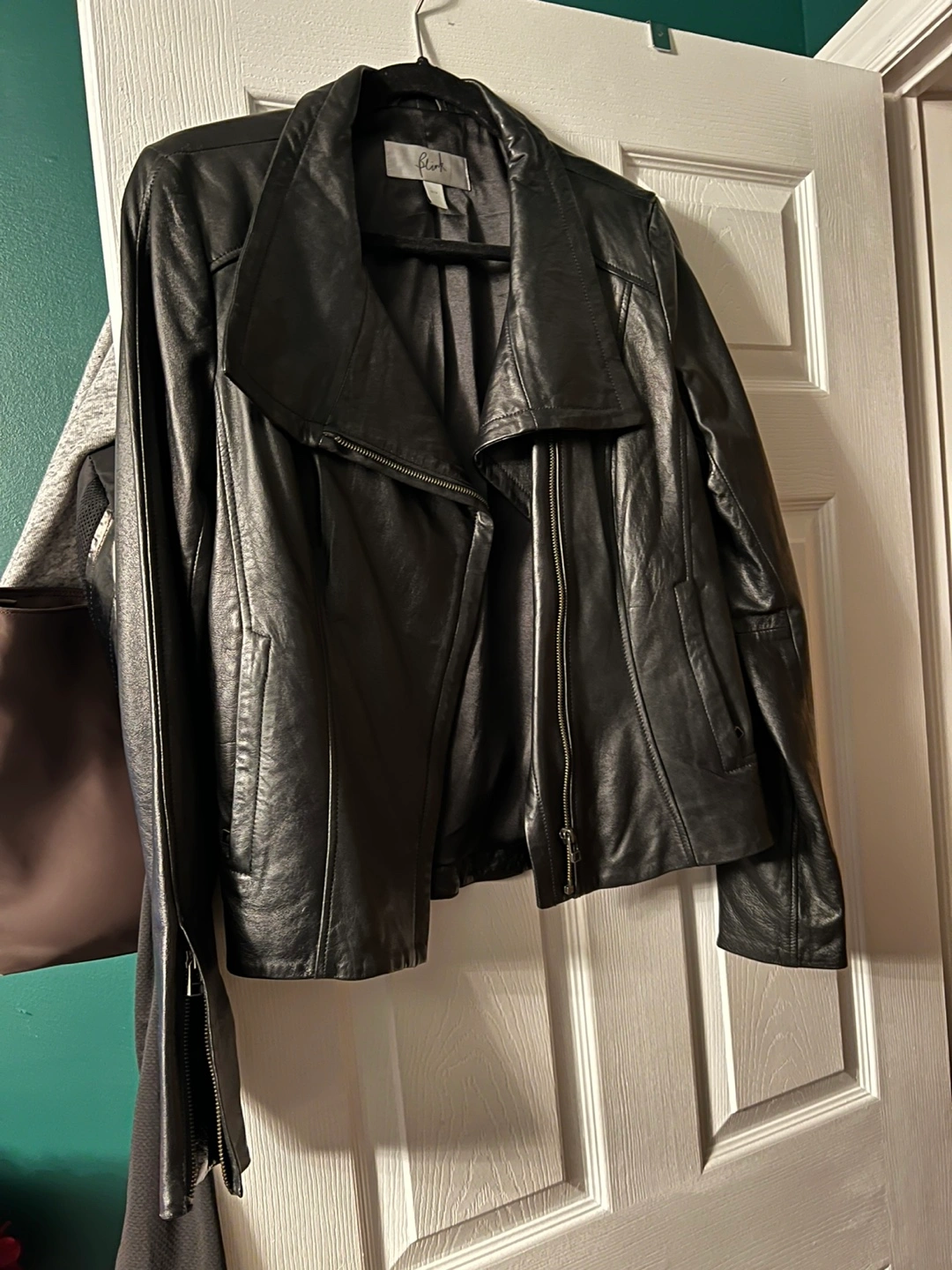 20Women's black leather jacket. Size medium. Asymmetrical zipper closure. Side zip pockets. Good condition.