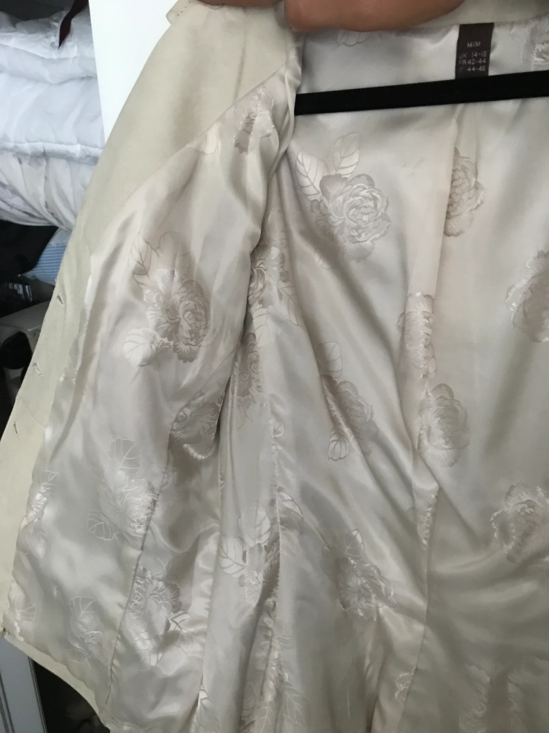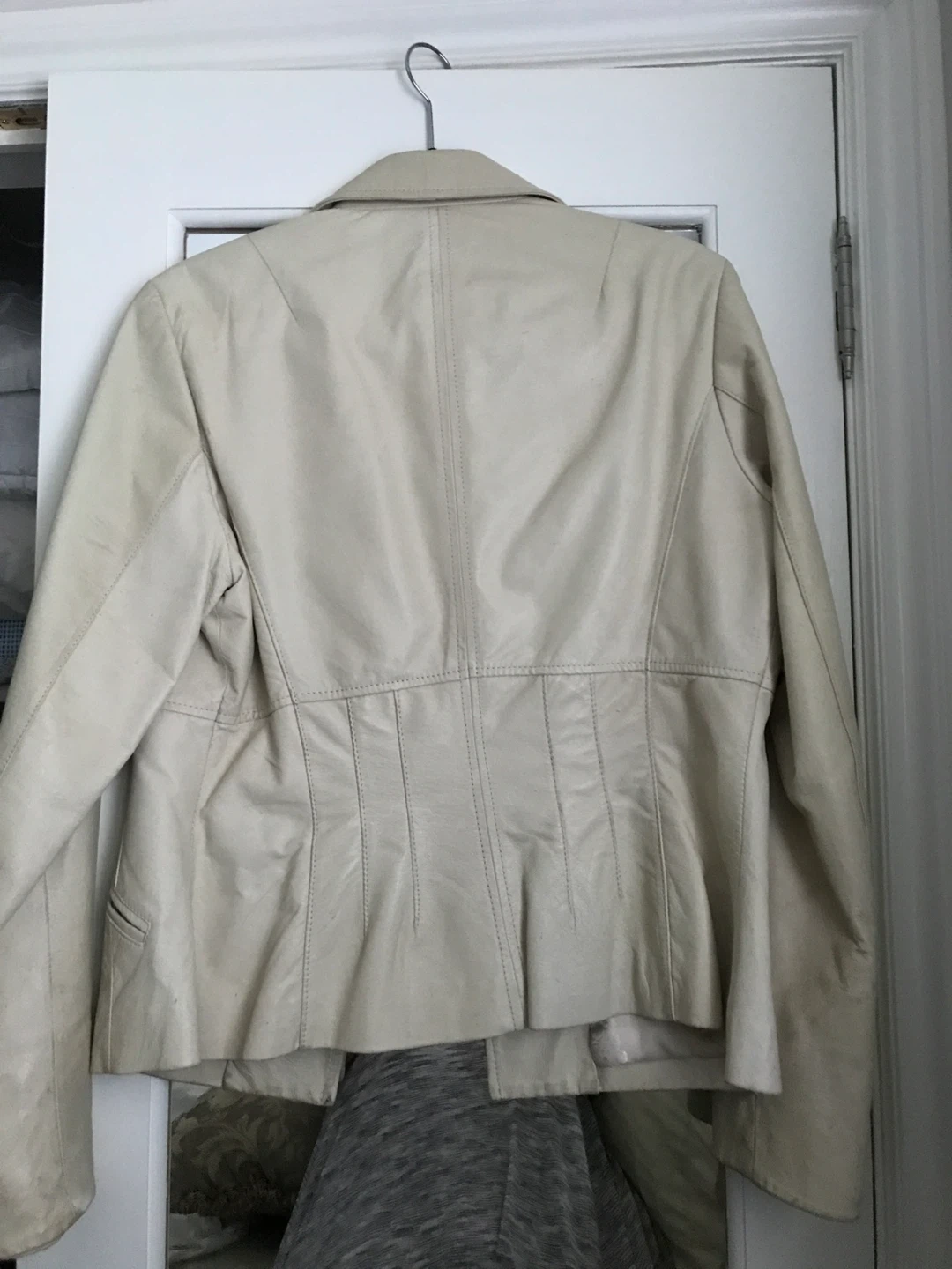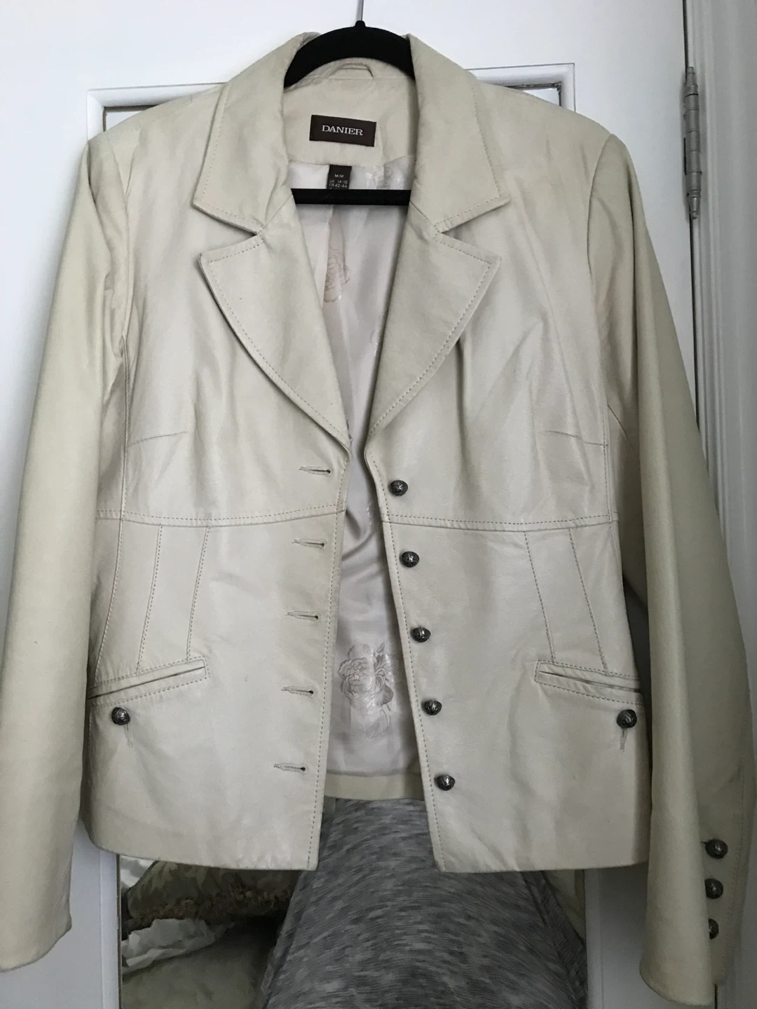 Selling a Danier leather blazer in size M. It's a beautiful cream colour and in great condition. Lovely embossed satin lining. Perfect for adding a touch of sophistication to any outfit!