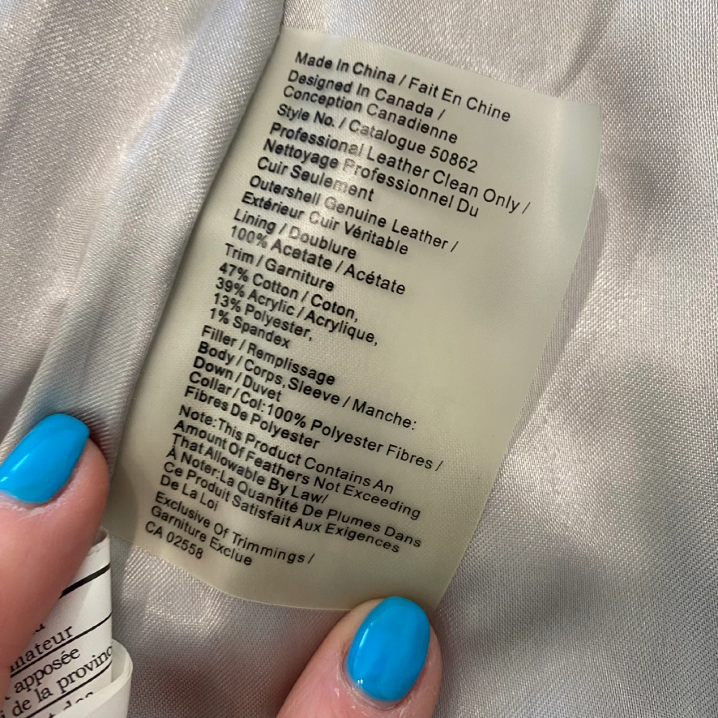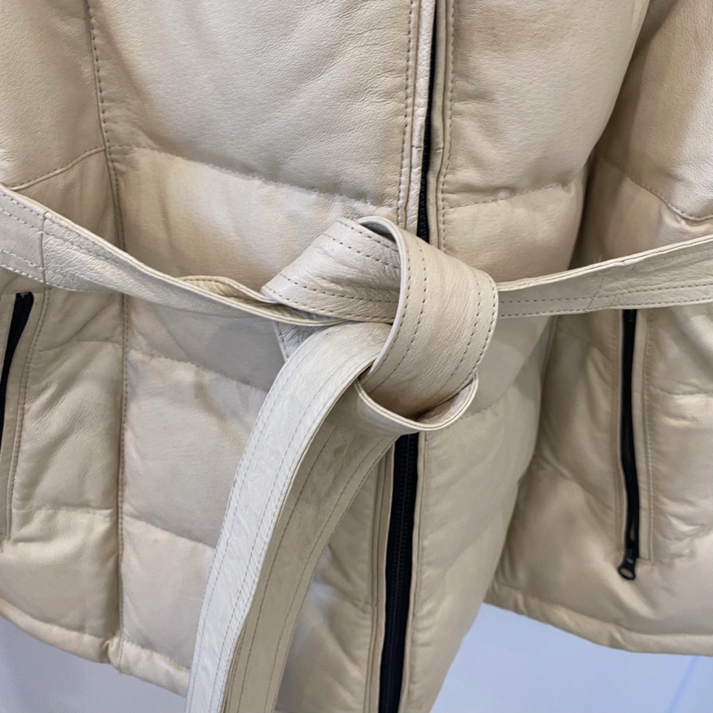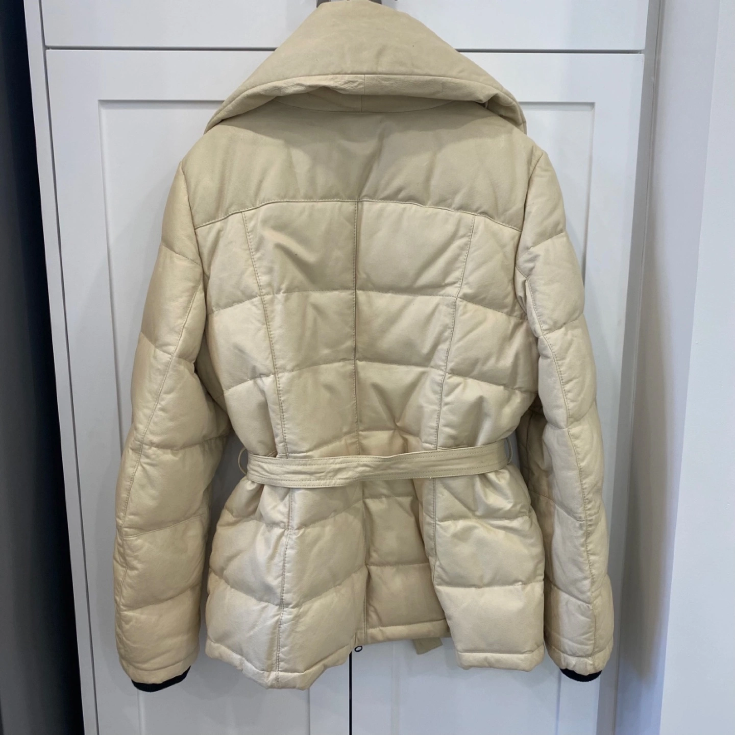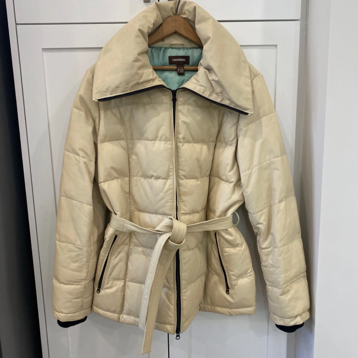 5Here's a stylish Danier leather down puffer jacket! The outer shell is genuine leather, and the lining is 100% acetate. The filler is down/duvet, and the collar is 100% polyester fibres. It has a belt to cinch the waist and keep you warm and cozy!