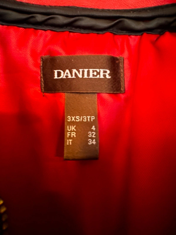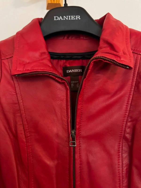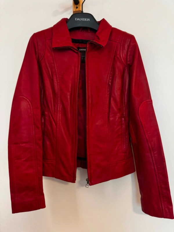 Danier Red Leather Jacket in a new condition never been worn. It retails for $ 500 plus tax. This includes a zip-out quilted inside vest which can be worn on colder days or removed when temperatures are milder. Brand: DANIER Size : XS Pick up in Erlton S.W. Cash only.
