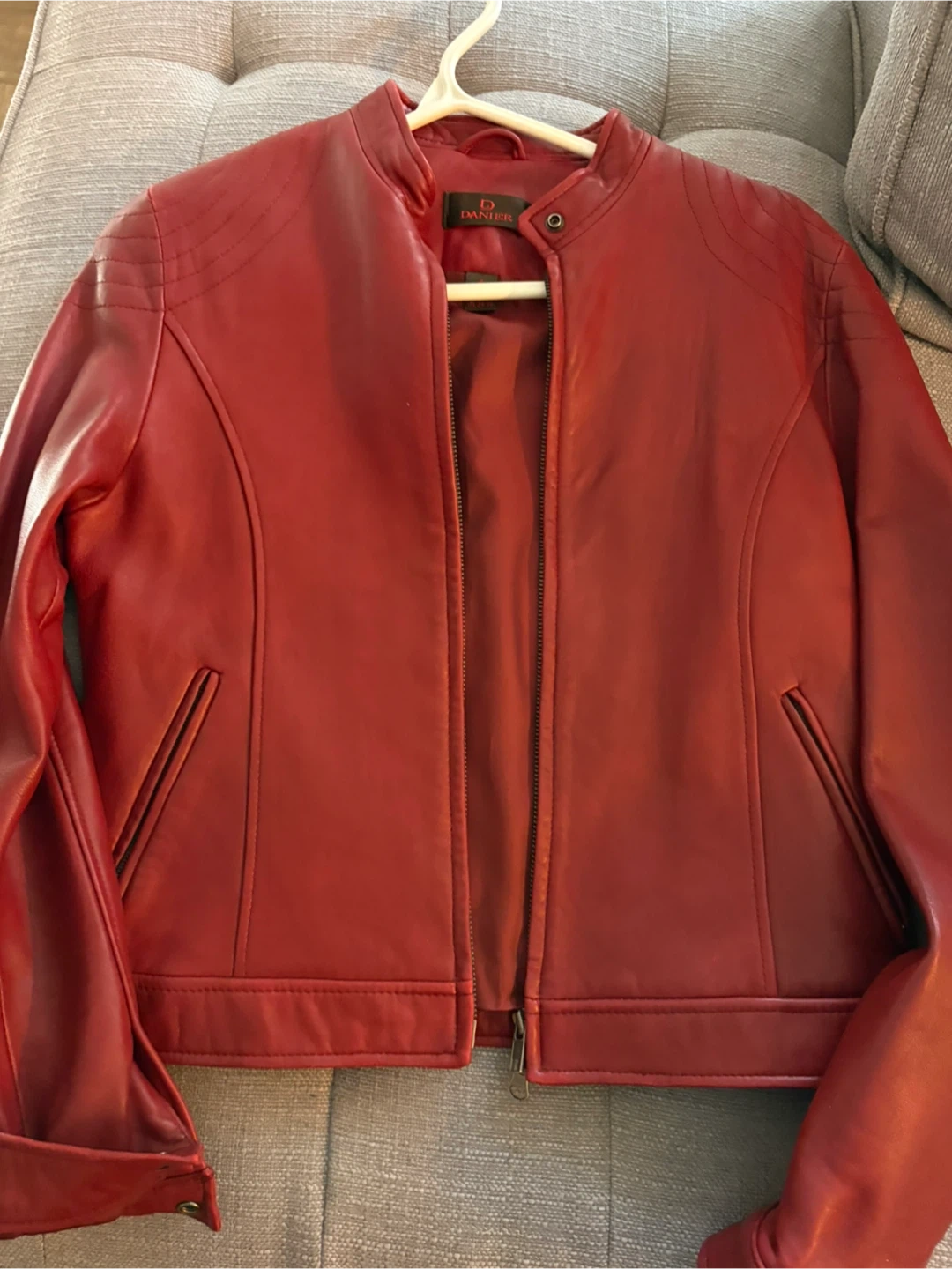 15A stylish red leather jacket from Danier! It's in great condition and ready for a new home. Perfect for adding a pop of colour to your wardrobe!