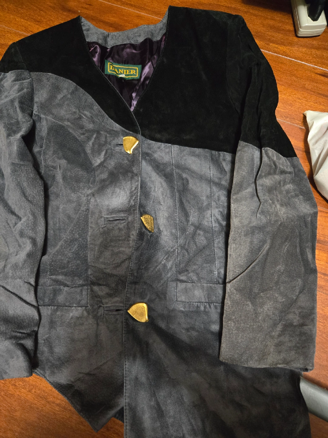25Selling a Danier suede leather jacket in great condition! Features a unique design with black accents and gold buttons. Perfect for adding a touch of vintage style to your wardrobe