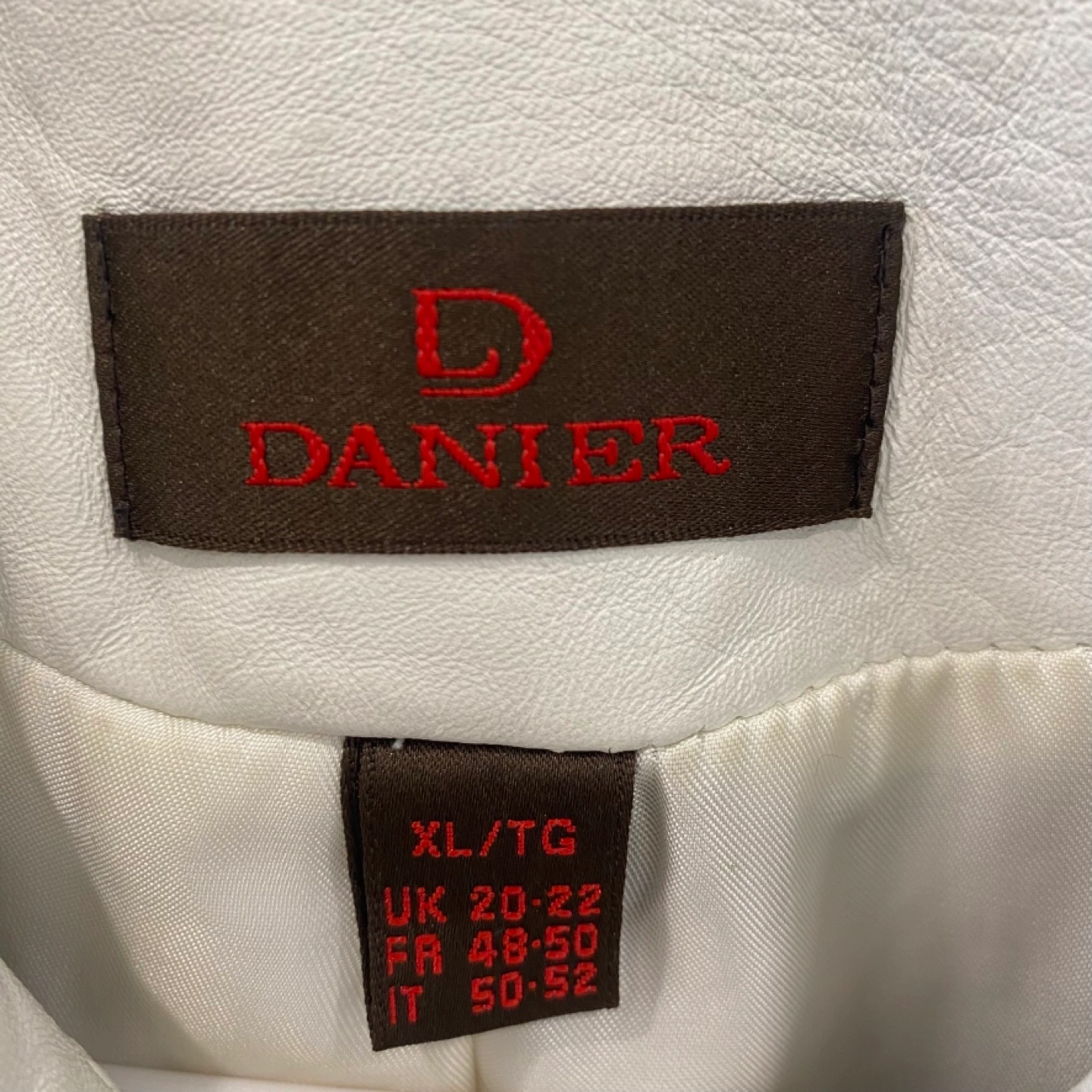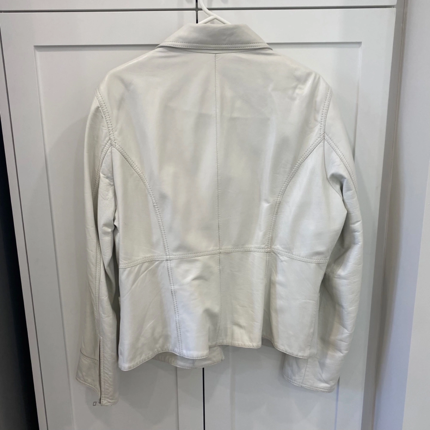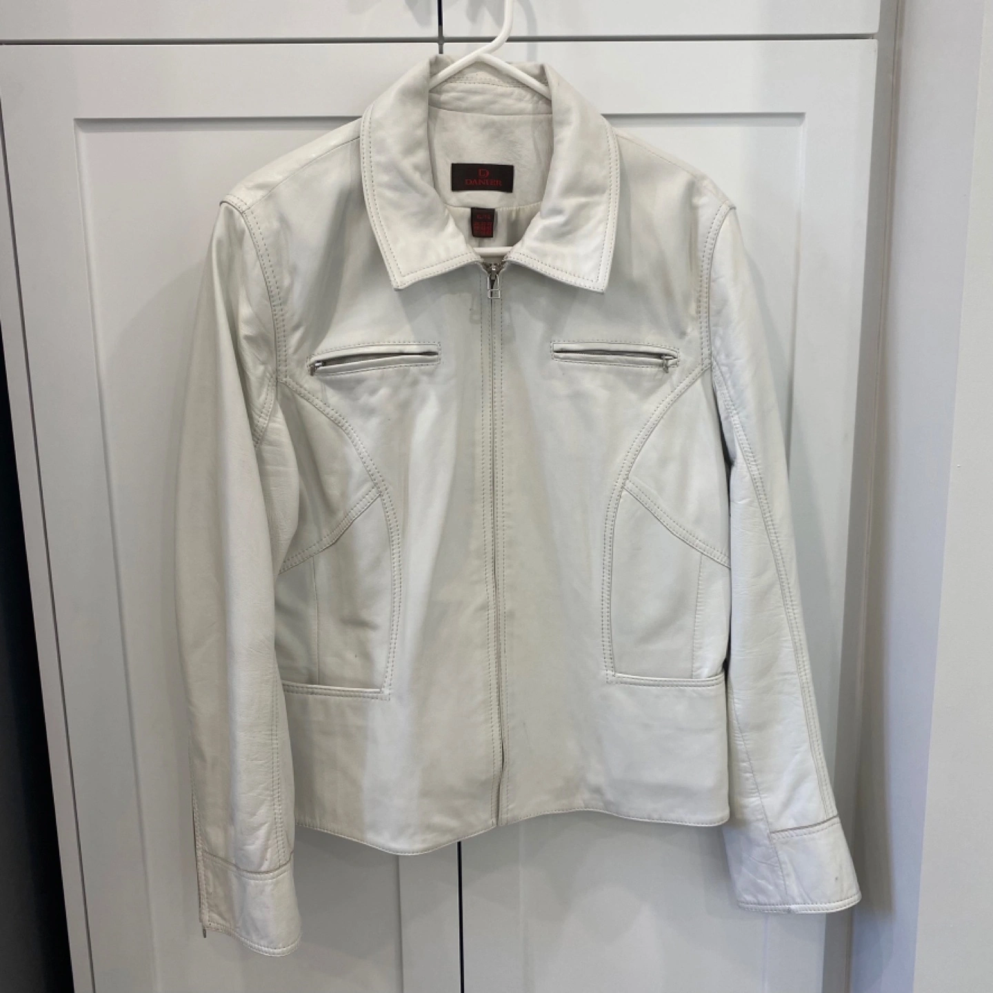 Beautiful white leather jacket. Features a collared neckline with a zipper closure. Has two zippered pockets on the front. An excellent addition to any wardrobe, especially on those breezy autumn days.
