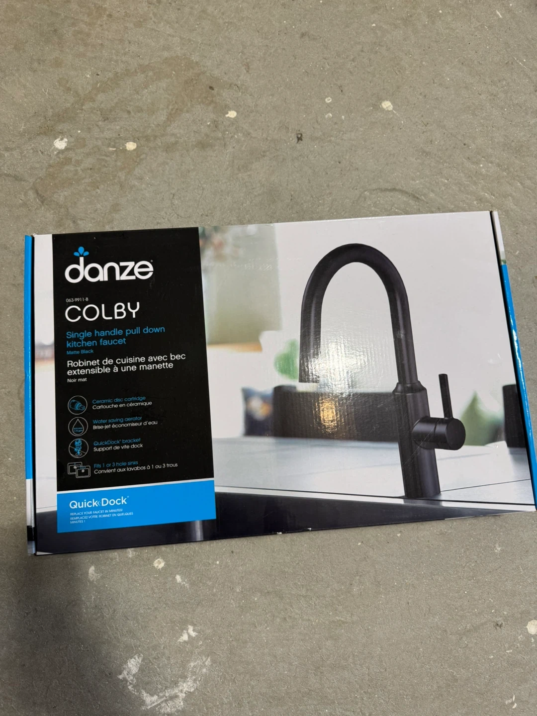 Selling a Danze Colby single-handle pull-down kitchen faucet in matte black! It's brand new in the box. This faucet features a ceramic disc cartridge and a water-saving aerator. It's designed to fit 1 or 3 hole sinks and has a QuickDock bracket for easy installation