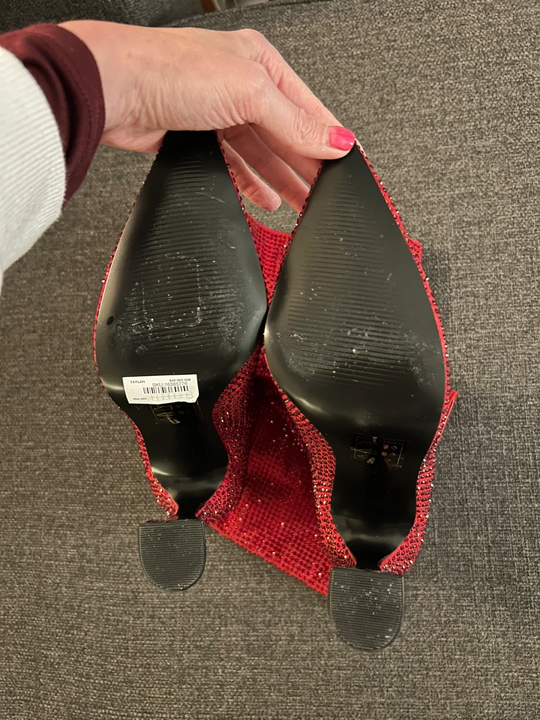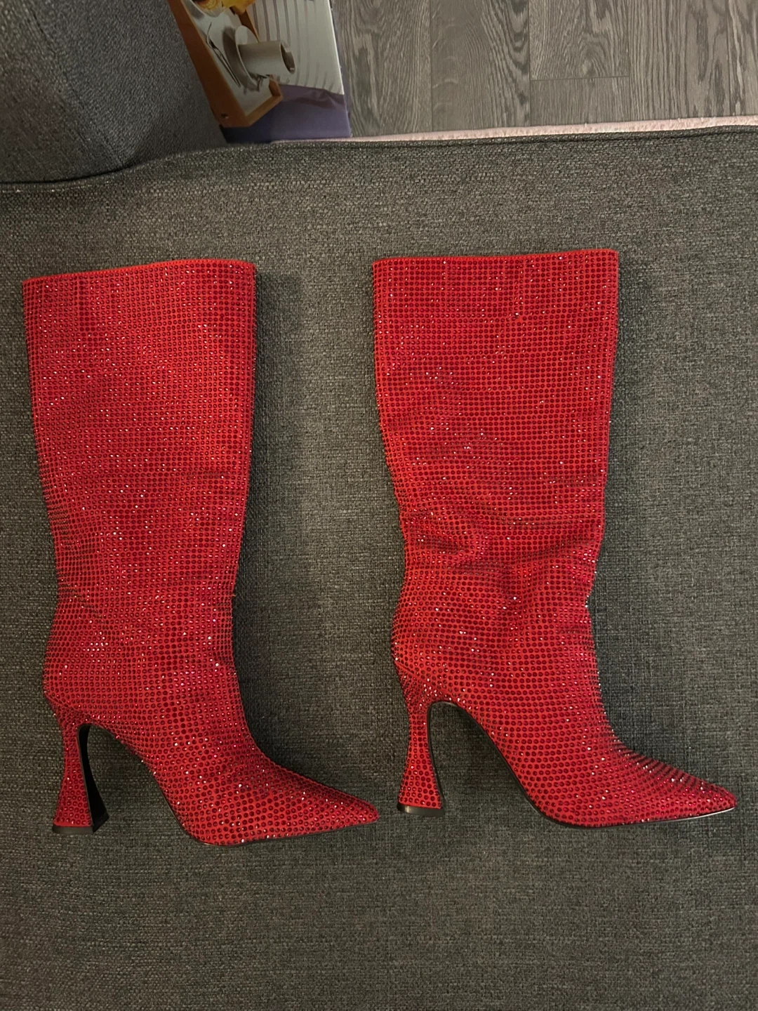 Aldo mid-calf dress boots embellished with red shiny, shimmery rhinestones.