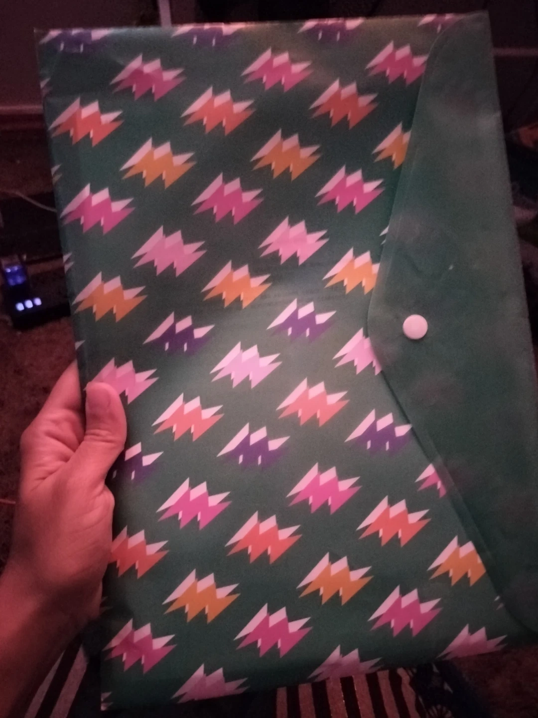 A cute document folder with a playful geometric pattern. It has a durable plastic snap closure to keep your papers secure. It's great for organizing schoolwork or important documents!