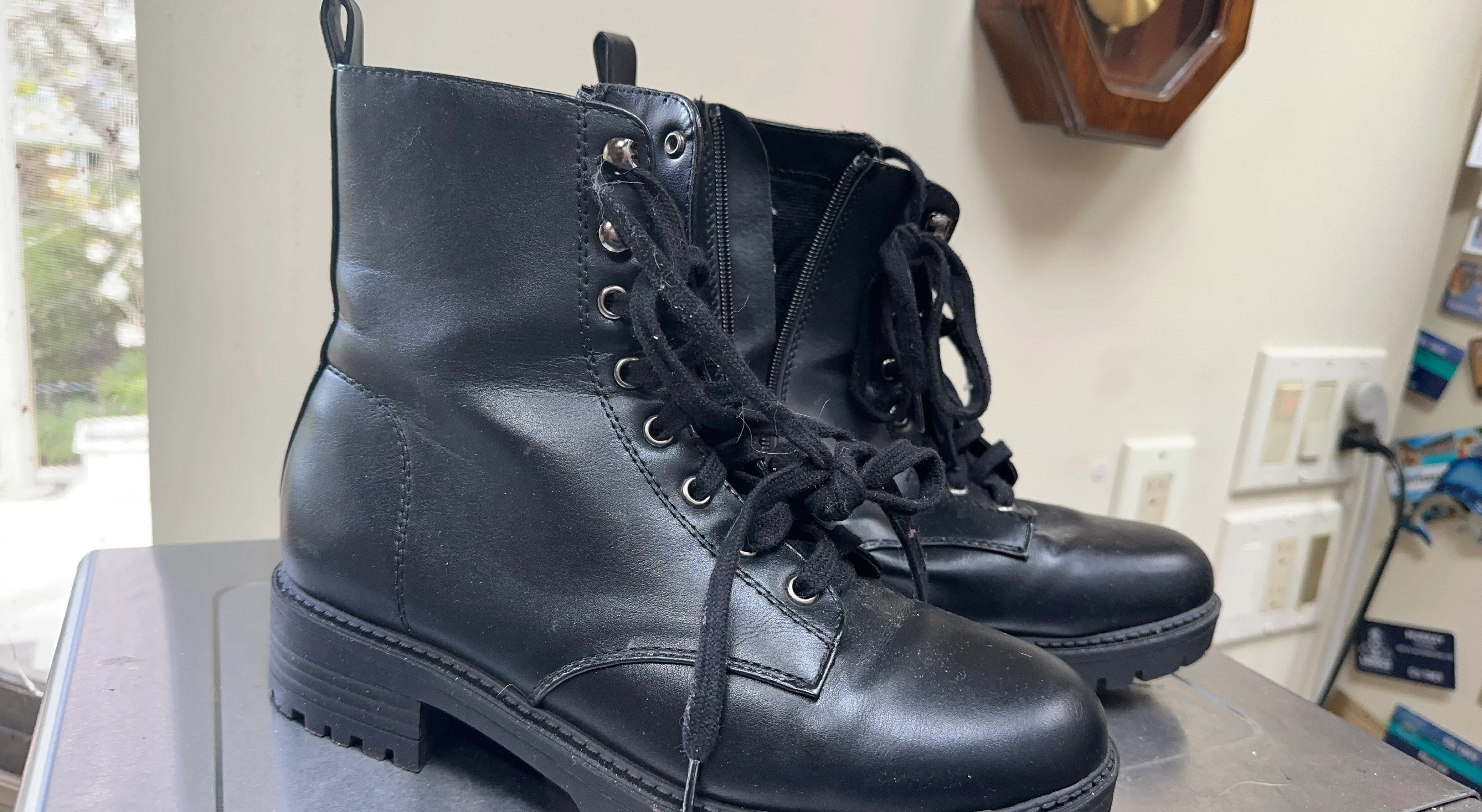 These are black combat boots with laces and side zippers. They have a durable sole and a faux leather exterior. Perfect for cool weather wear!