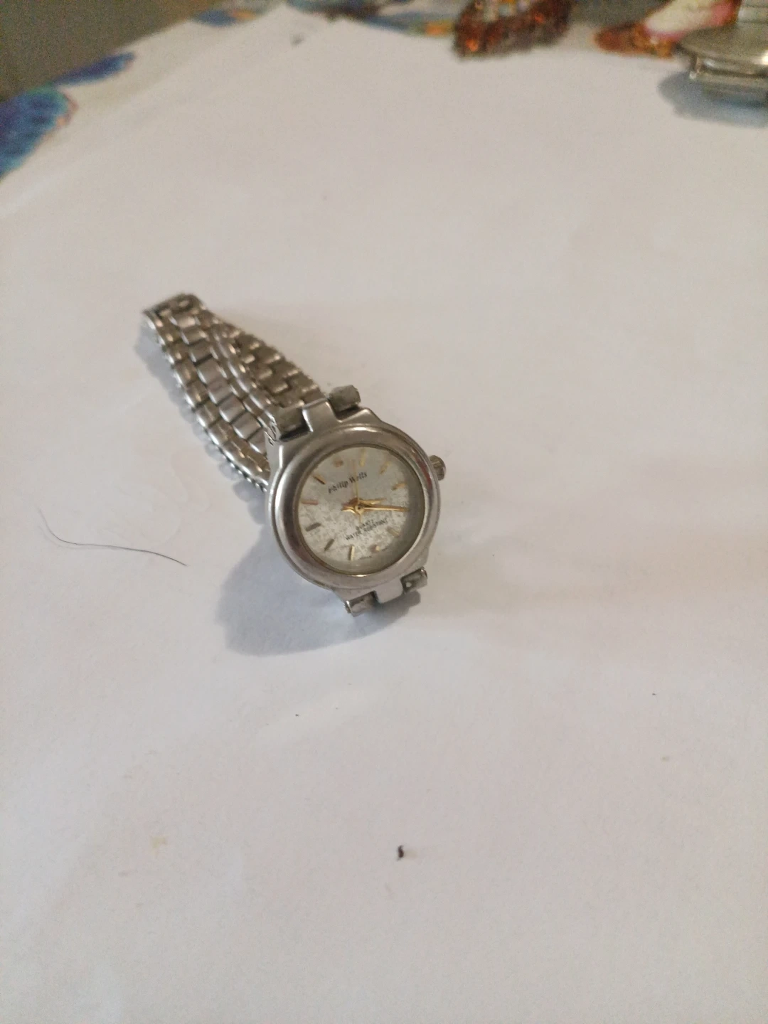Philip Wells women's wristwatch with a silver-tone metal band and case. Features a quartz movement and water resistance.