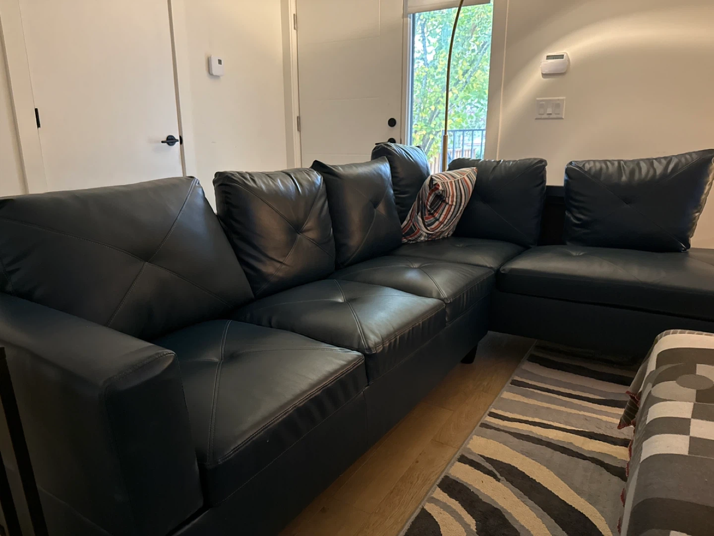 10Selling a comfortable black leather sectional sofa. It's in great condition and would be a perfect addition to any living room! Needs a little servicing near the arm rest. Very minor work. Priced accordingly . Original Price around 800$ Priced to sell at 400$