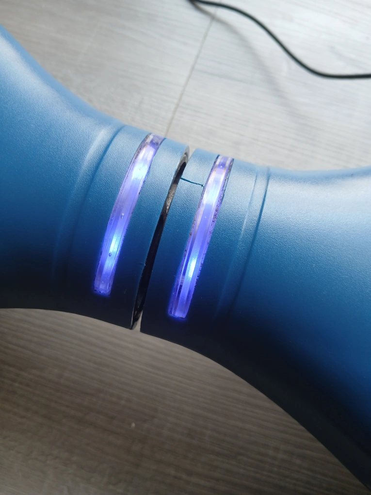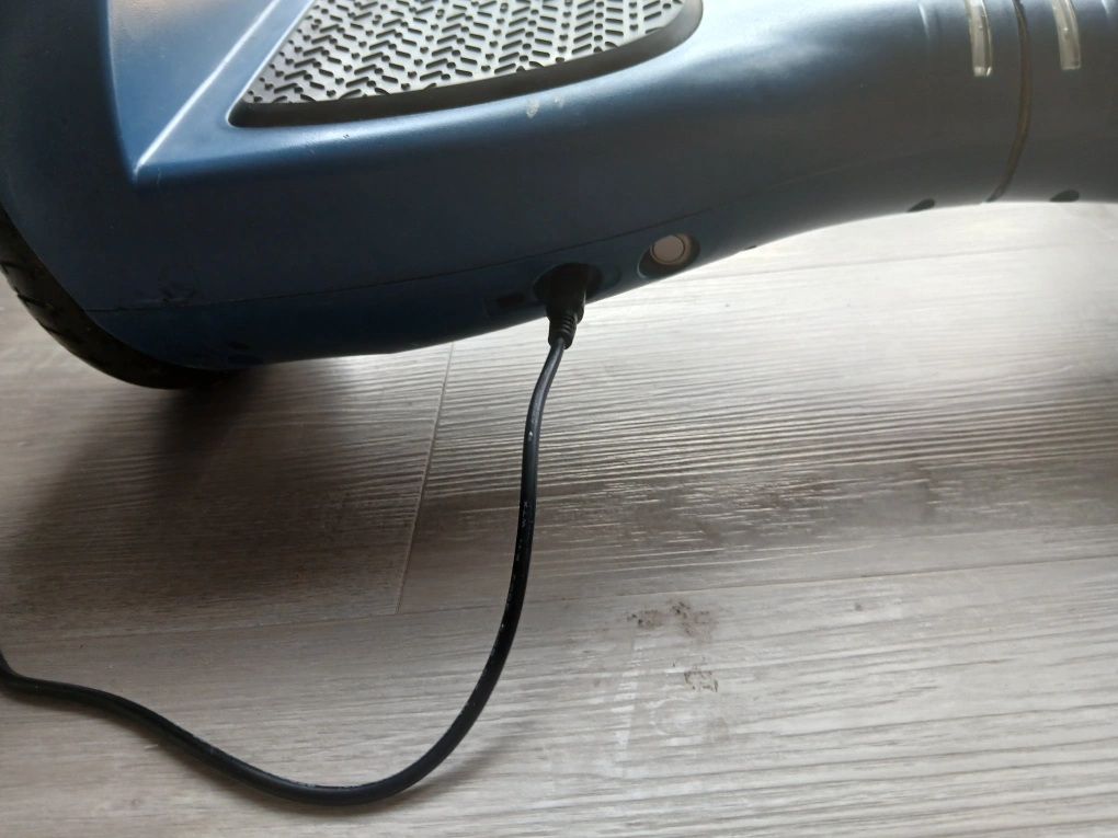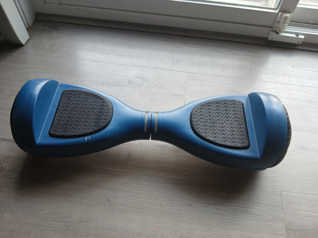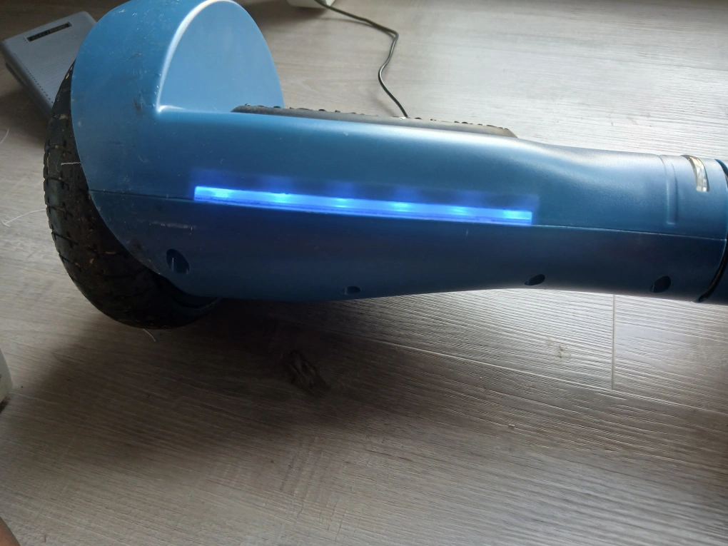 21A blue hoverboard, featuring black footpads. Charging cable included. The hoverboard seems to have lights. You could easily spend a relaxing afternoon gliding along, taking in the scenery.