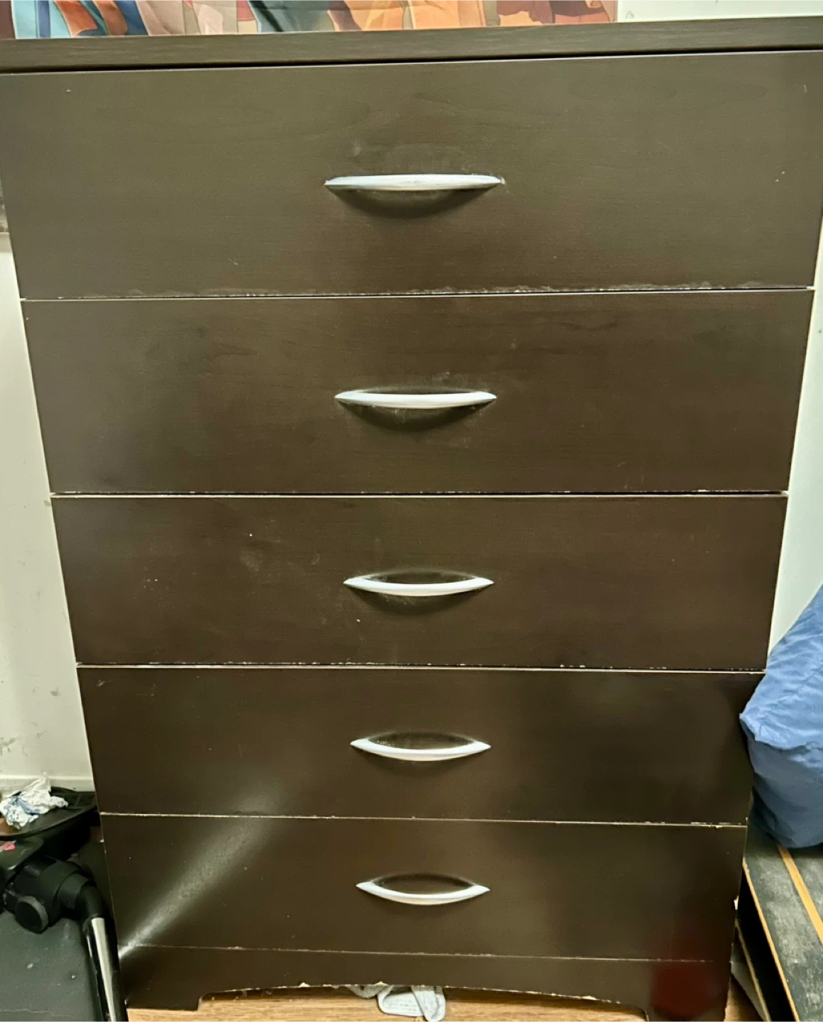 Selling a dark brown chest of drawers with five drawers. It's in used condition, perfect for extra storage in a bedroom or closet. The dresser features silver-tone handles. Please take a look at the pictures for details!