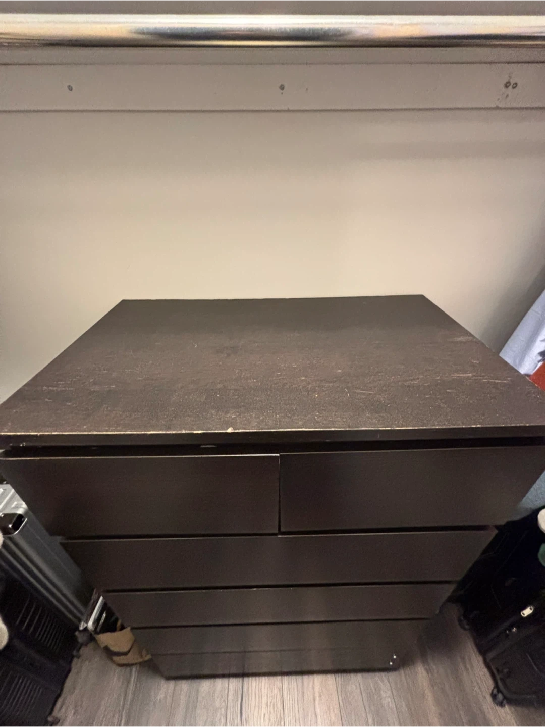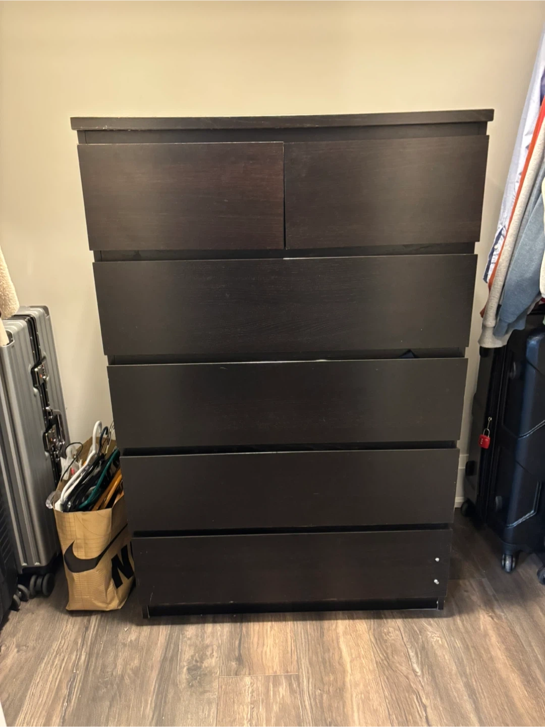 81Selling a dark brown ikea dresser with six drawers. It has some signs of wear on the top, as shown in the pictures, but is still a sturdy and functional piece of furniture