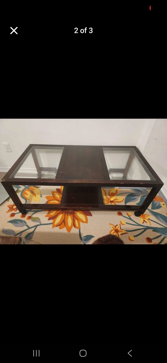 Here's a coffee table with a dark brown wooden frame and glass inserts on top. It has a shelf underneath for storage. There are some signs of wear and tear on the wooden frame as pictured, but it's still a sturdy and functional piece of furniture