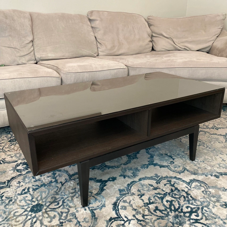 169Here's a stylish coffee table with a dark brown finish and a sleek glass top. It has a modern design that would look great in any living room. Perfect for holding your coffee, books, or decor!
