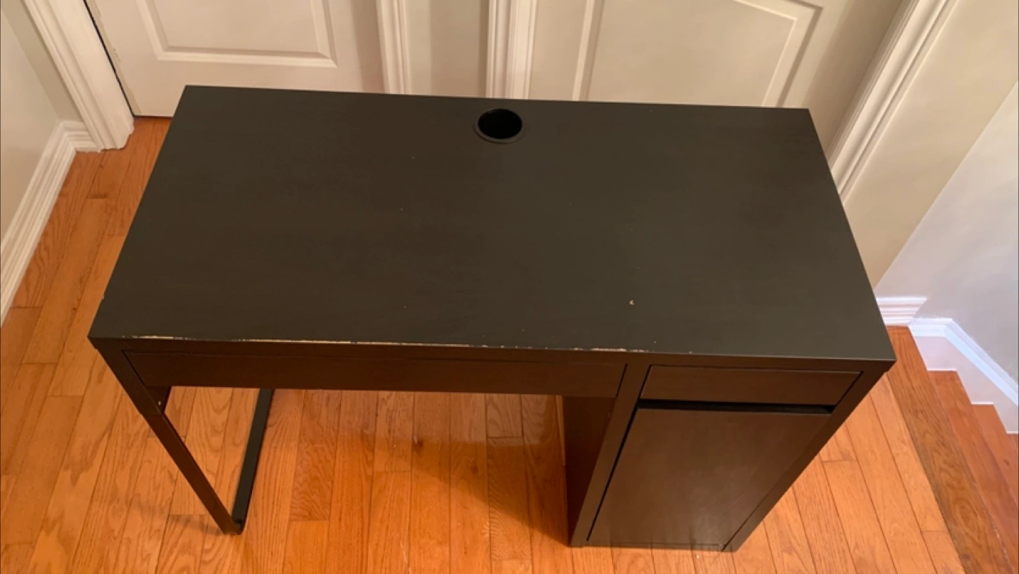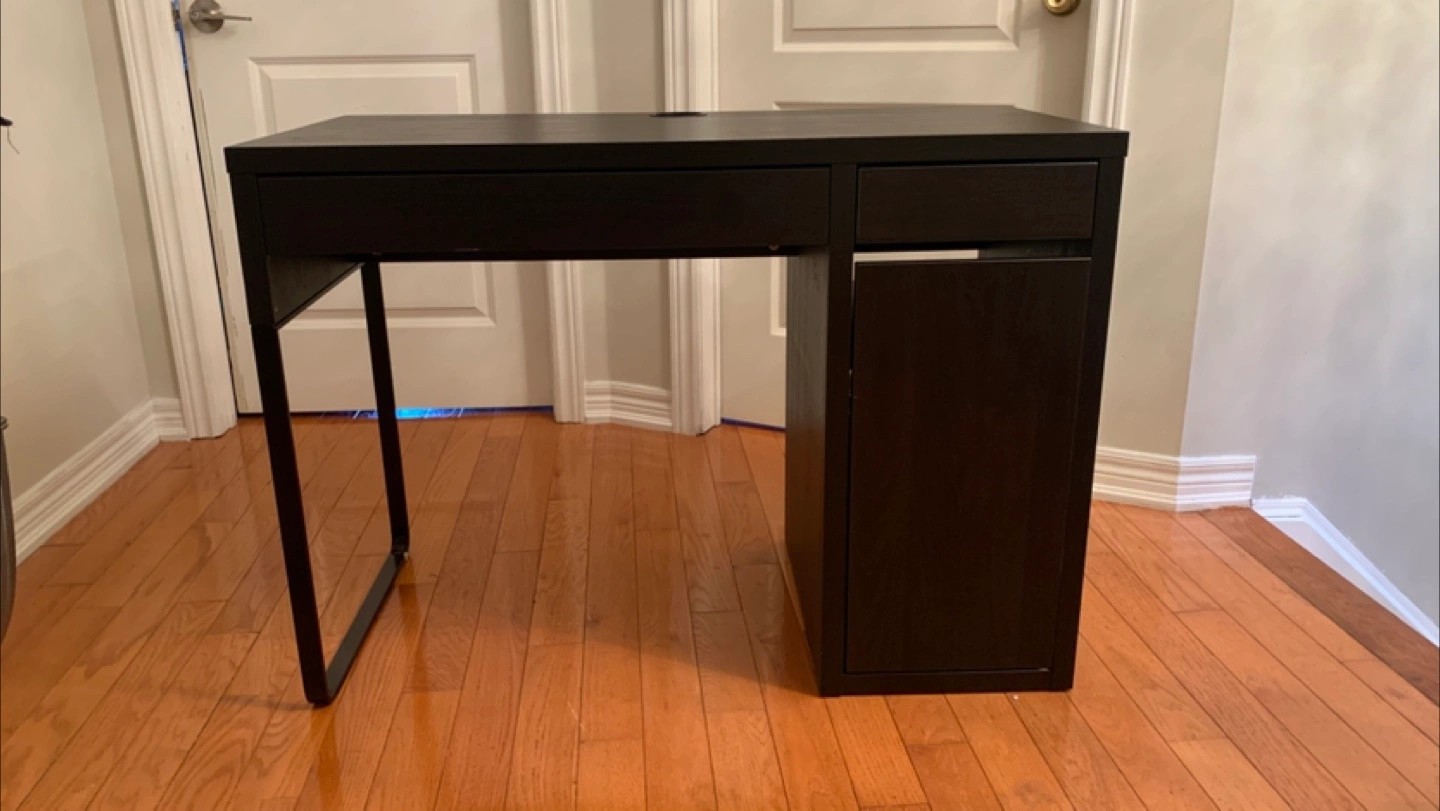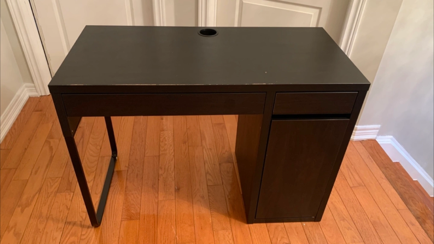 10A dark brown desk. Features a drawer and a cabinet with a handle. Has a hole for wires. This desk offers a dedicated space where you can focus. IKEA Desk Available for pickup only