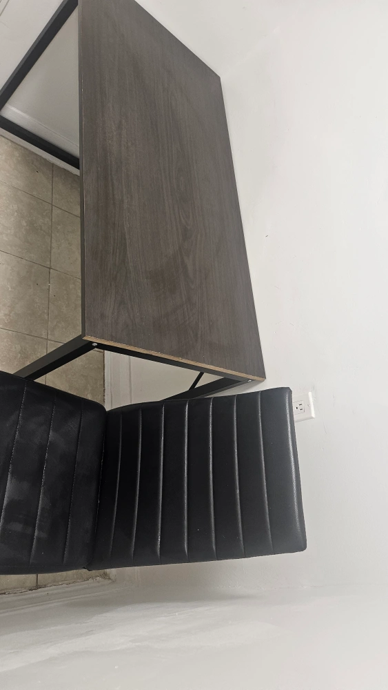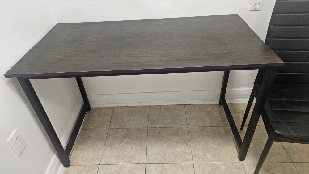99Selling a dark brown desk with a sleek black chair. It's a great set for a home office or study space. The desk has a wood-like finish and a sturdy metal frame. The chair is also in great condition and very comfortable!