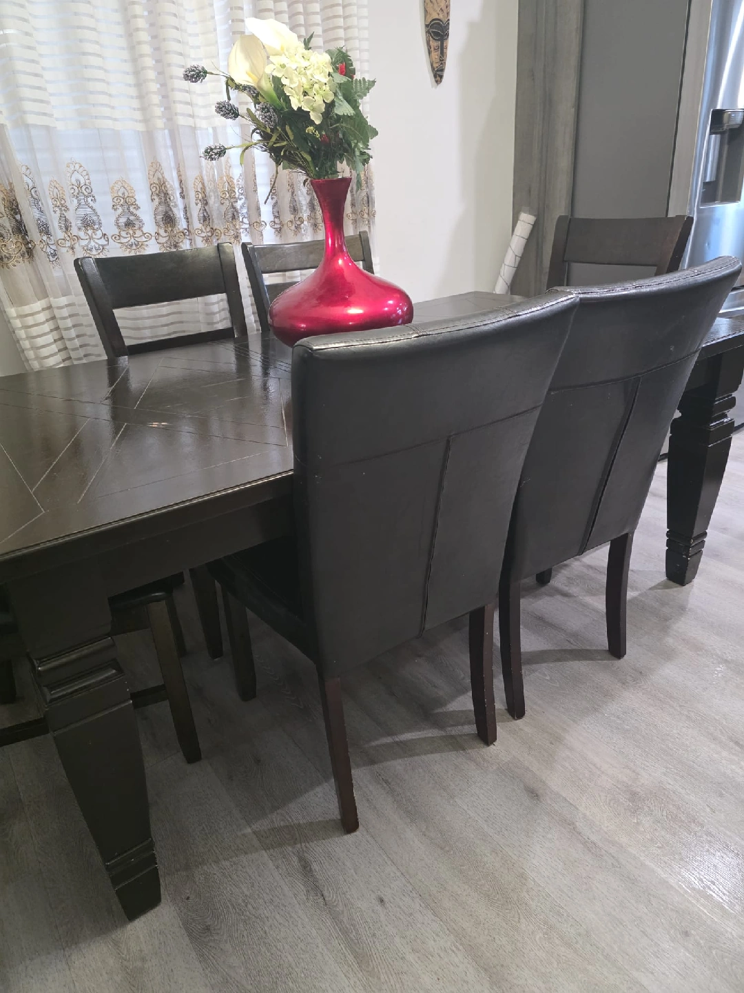 10Selling a dark brown dining table that comes with six chairs. It's a great set for family dinners or entertaining guests. The table has a unique design on top, and the chairs are comfortable with leather-like padding. There are some minor signs of wear, but overall it's in good condition and ready for a new home!