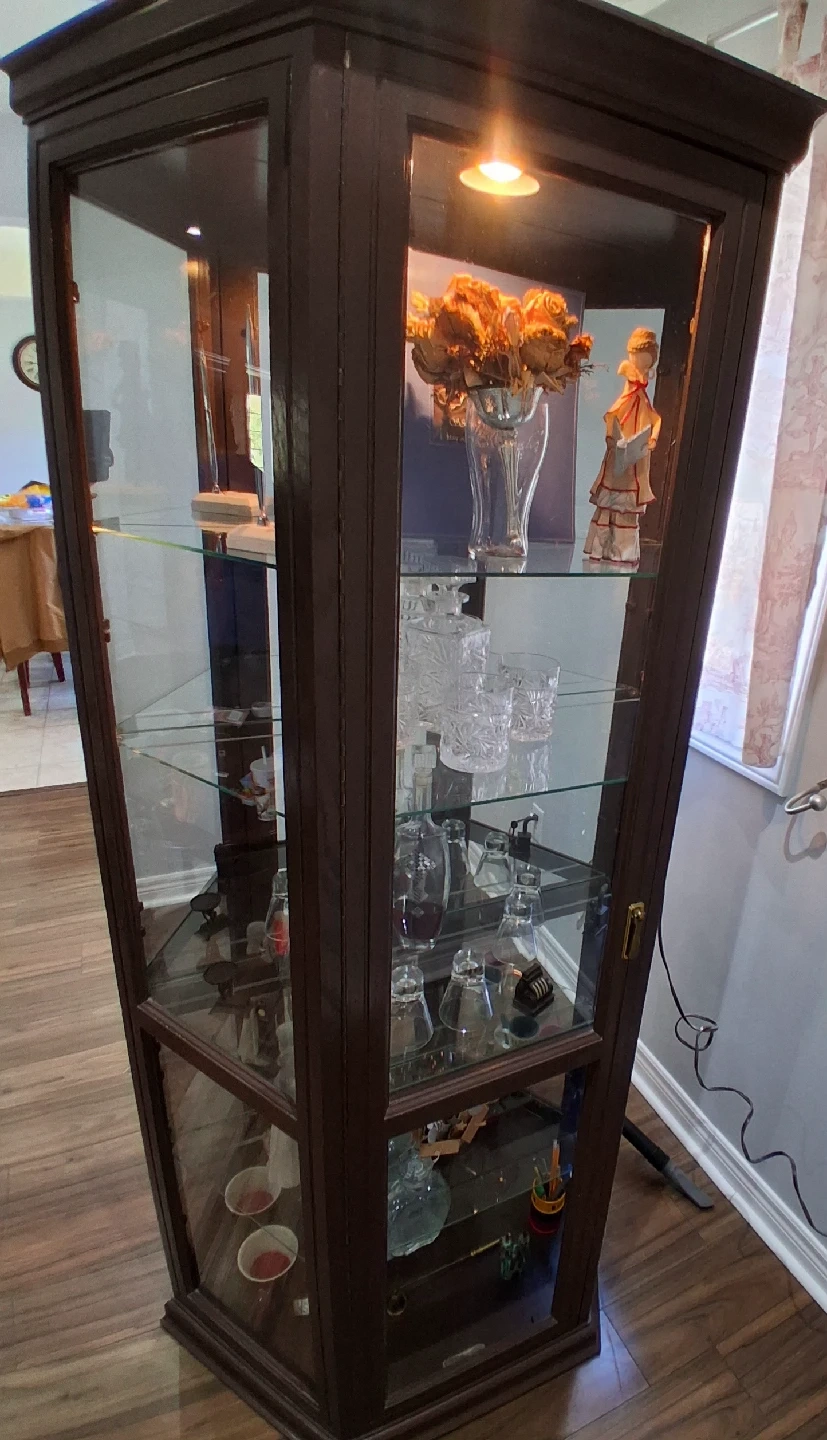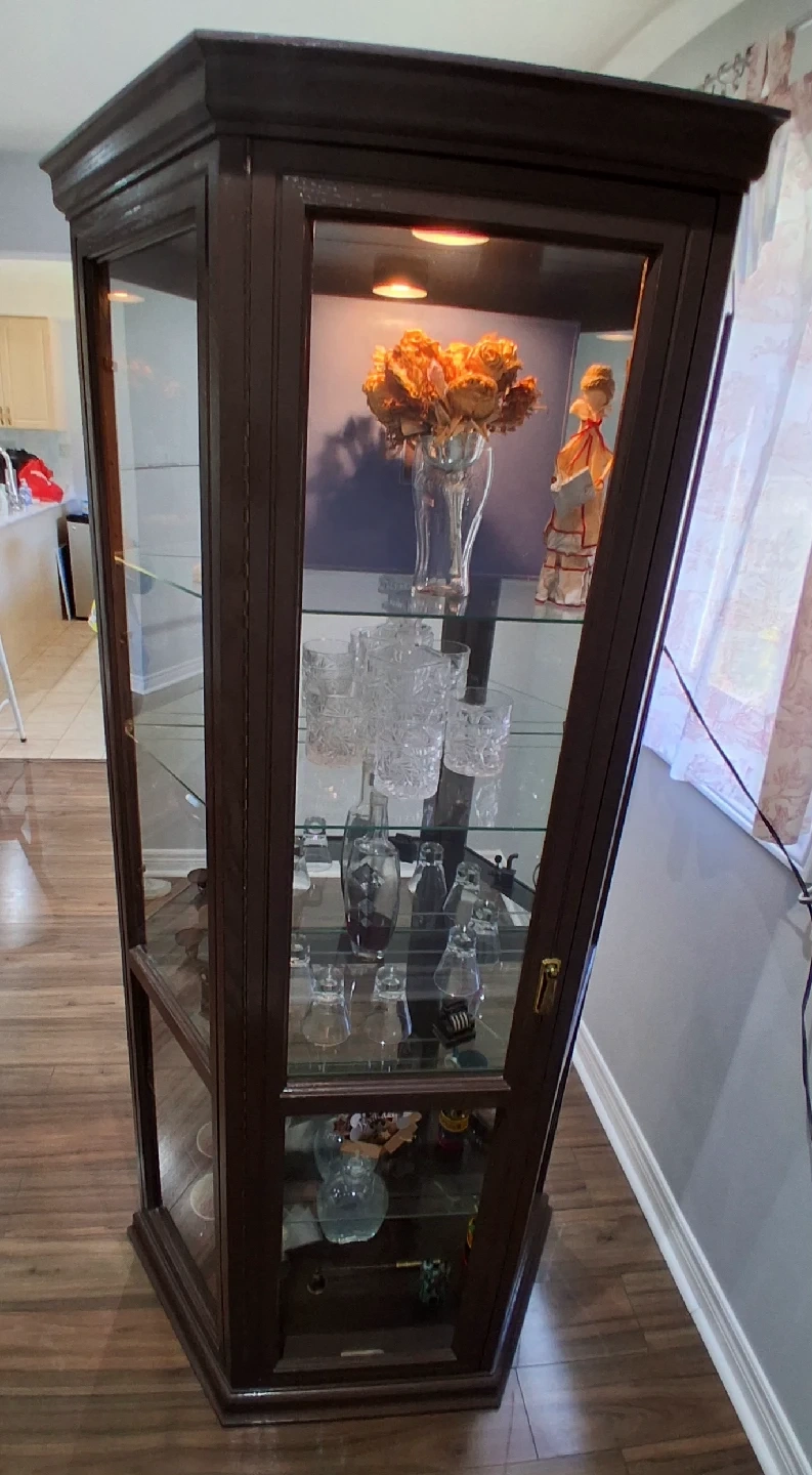 60Selling a dark brown display cabinet. It's in good condition and perfect for displaying your favourite items. The cabinet features glass shelves and a built-in light to showcase your collectibles or glassware. It would be a lovely addition to any living room or dining area