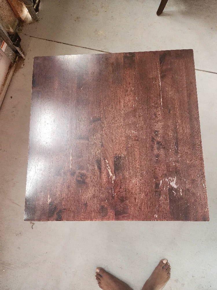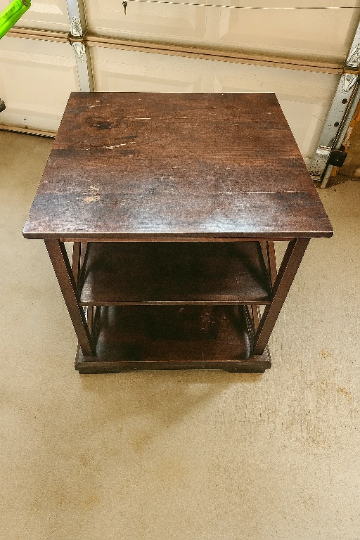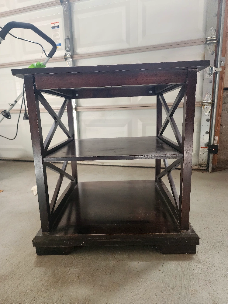 Dark brown end table with two shelves. It's in good condition and would look great in any living room or bedroom. Perfect for holding lamps, books, or other decorative items! Light scratches on top. Refer pic