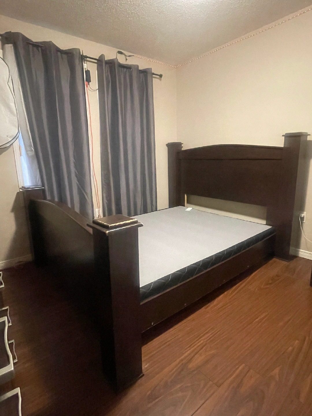 10Selling a queen-sized bed frame and a matching nightstand. Both are a dark brown colour and in good condition. Perfect for adding a touch of elegance to your bedroom!