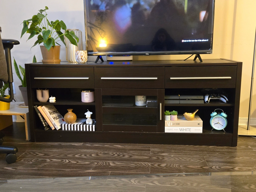 Modern Dark Wood TV Stand / TV Unit Entertainment Unit - Excellent Condition Elevate your living room with this stylish and functional dark wood TV stand. It features: - 3 spacious drawers with sleek silver handles - 6 open and closed shelves perfect for books, décor, media players, and gaming consoles