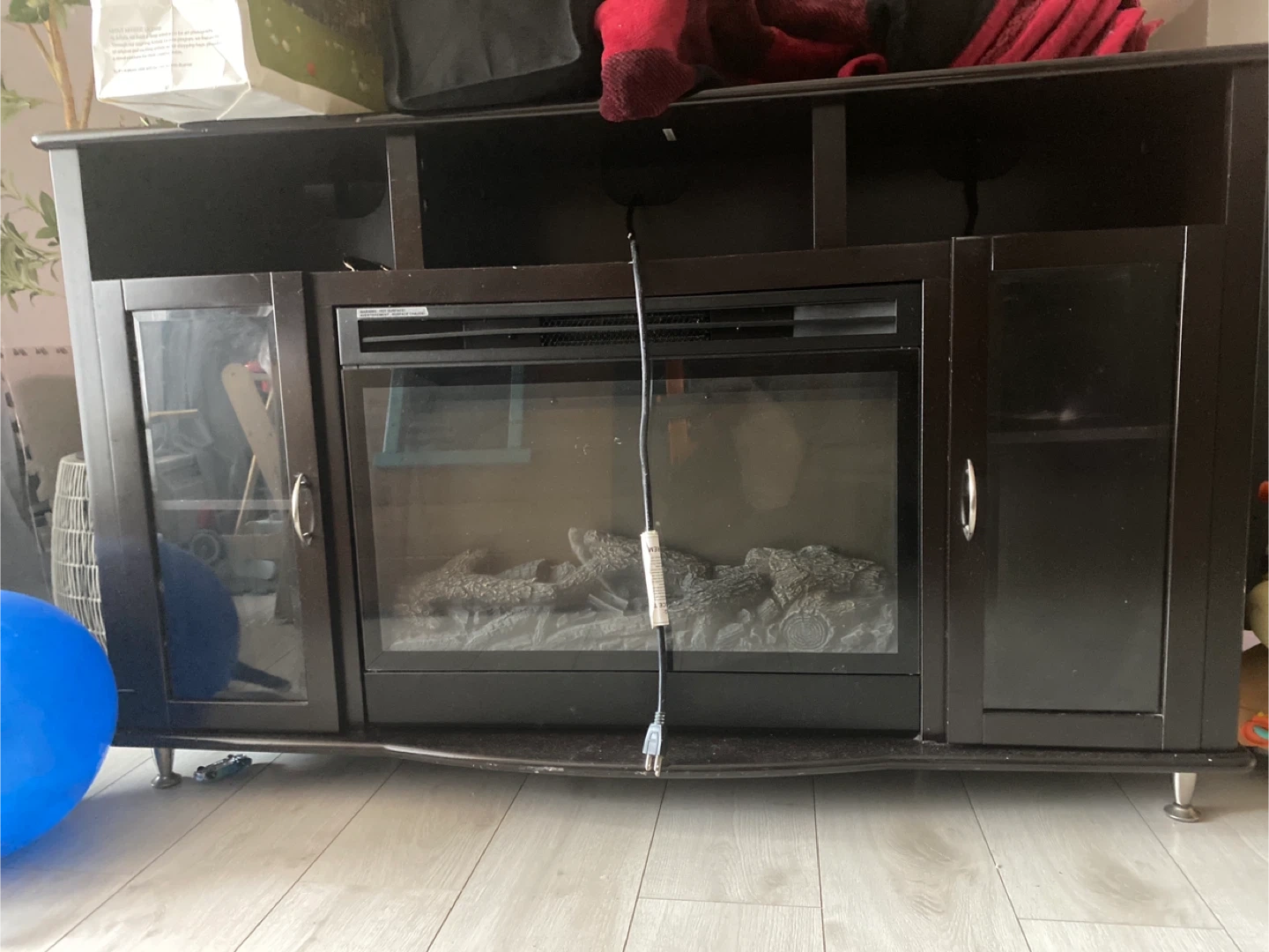 Selling a dark brown TV stand that has an electric fireplace built in. It's a great way to add some warmth and ambiance to your living room. The stand also has storage space for your media devices and accessories. It's in good condition and ready for a new home!
