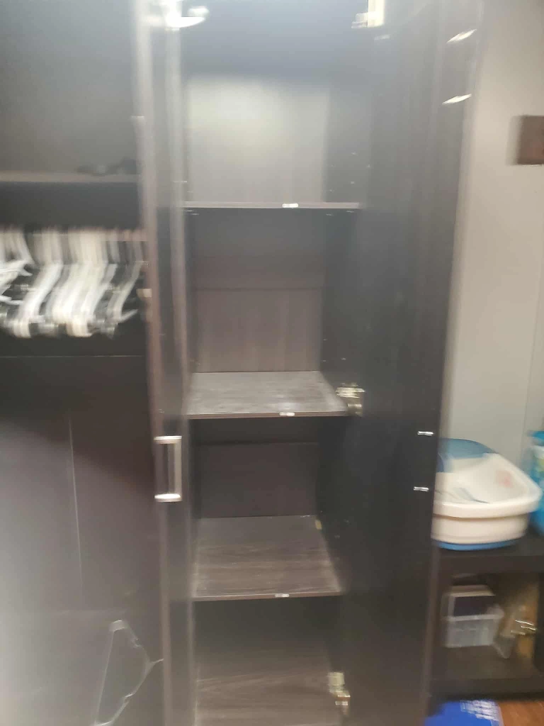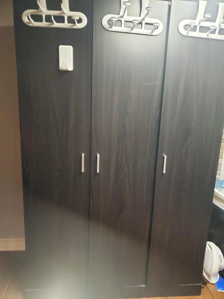 Selling a dark brown wardrobe in good condition. It features multiple shelves and a hanging rod for clothes. Perfect for adding extra storage space to any room