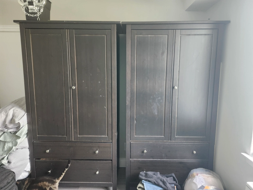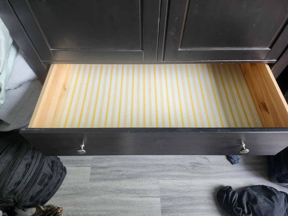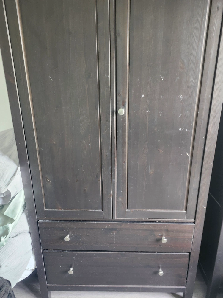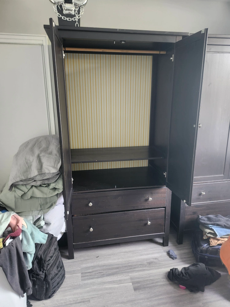 0Here's a dark brown wardrobe, perfect for adding some extra storage to your space! It features two doors and two drawers at the bottom. Inside, you'll find a rod for hanging clothes and a shelf for additional storage. The drawers are lined with a cute yellow and white striped paper