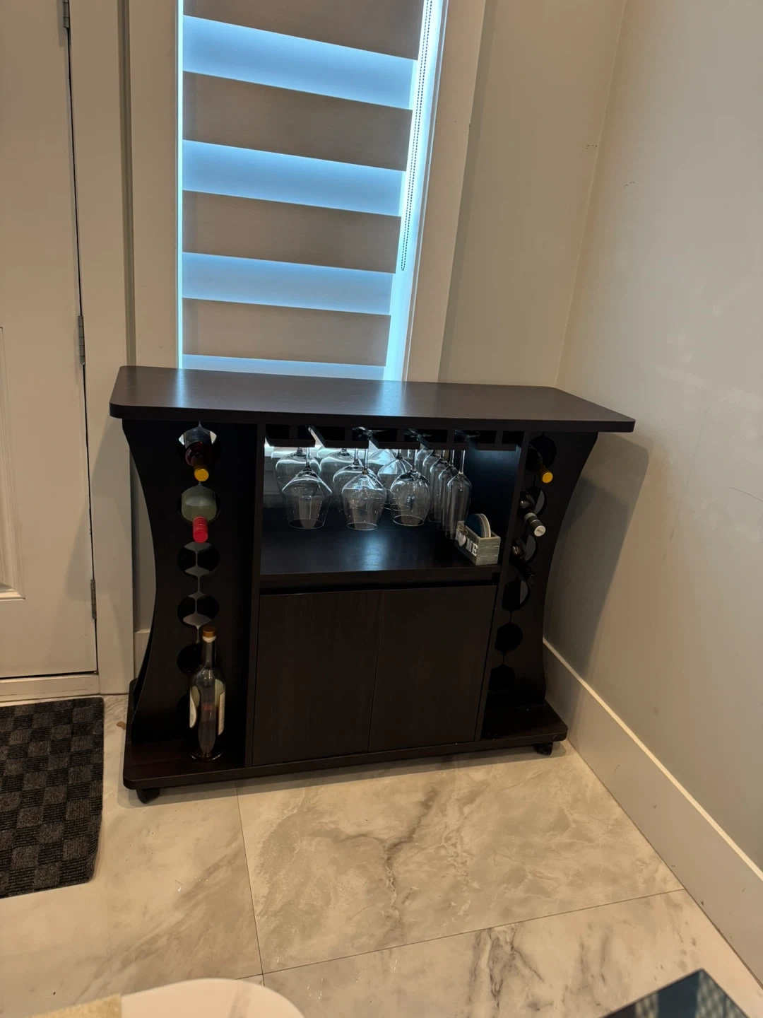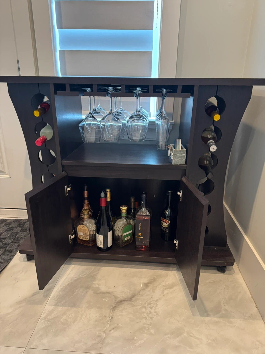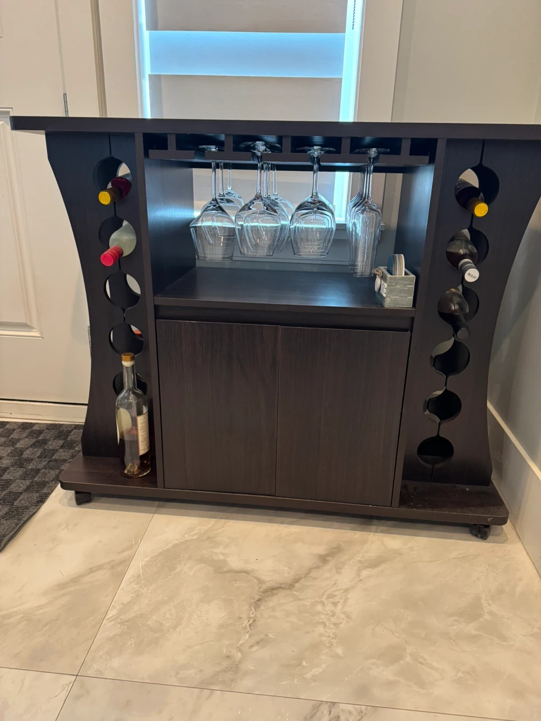 19Selling a dark brown wine rack table. It has space for wine bottles, glasses, and storage behind the cabinet doors. Perfect for a dining room or living room!