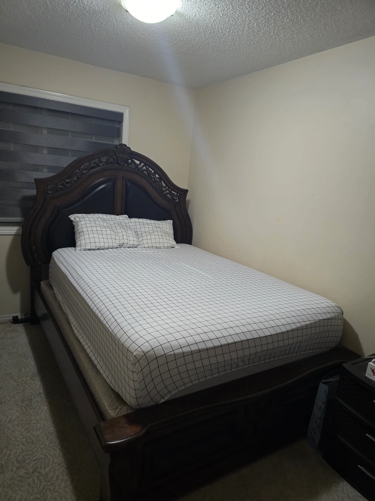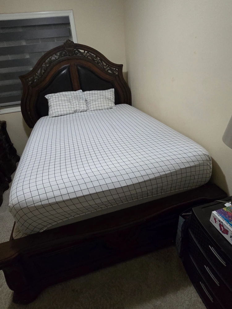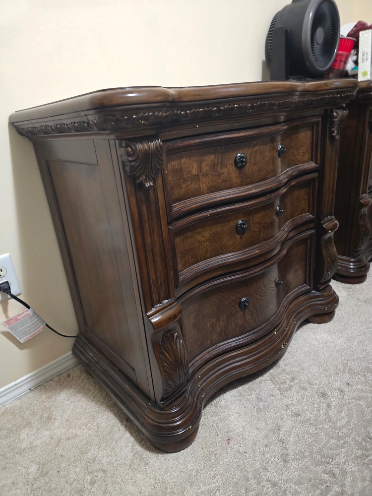 18Selling a dark brown wood bed frame with 2 identical matching nightstand. The set features ornate detailing and a classic design. Perfect for adding a touch of elegance to your bedroom!