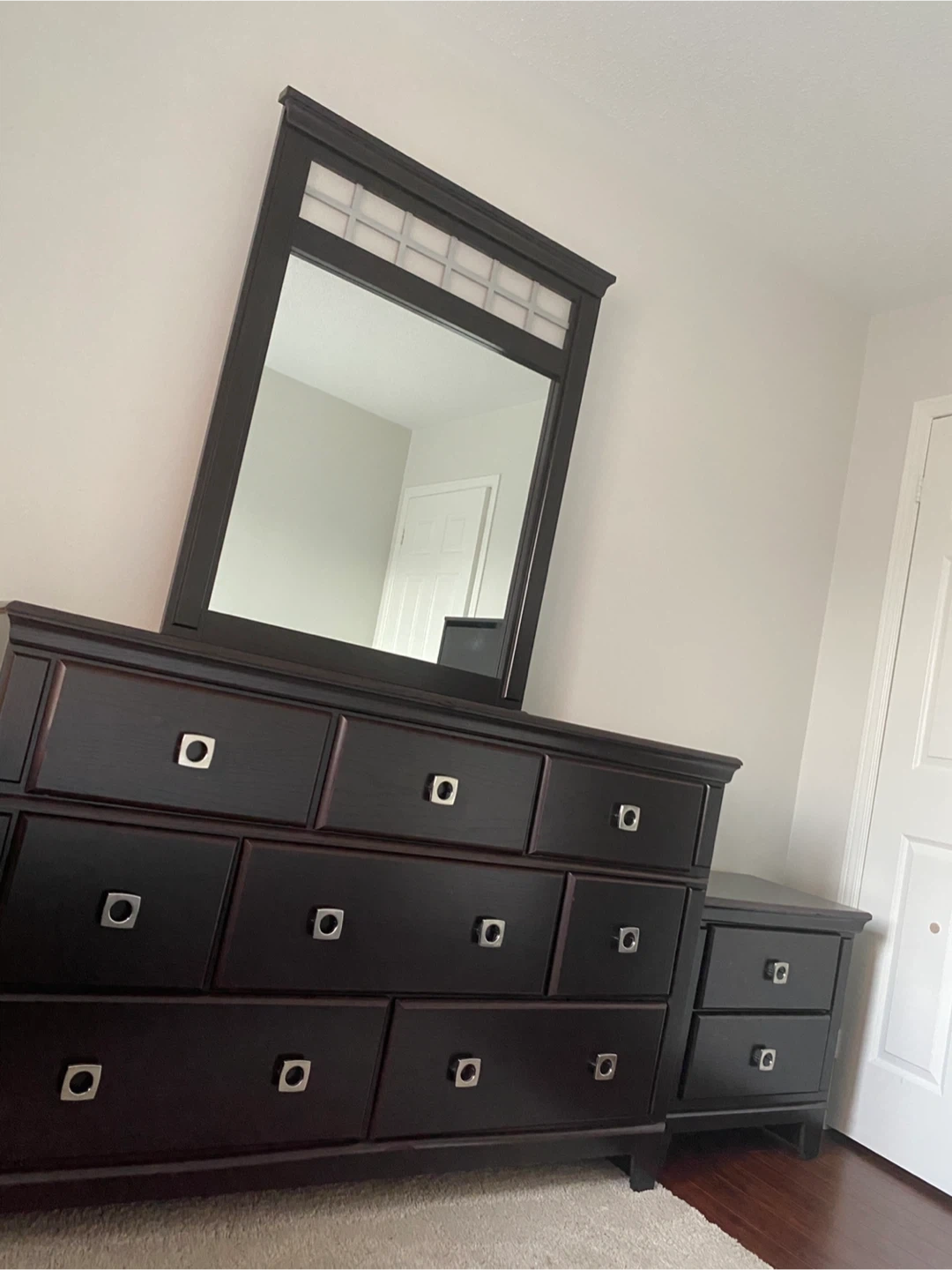 Dark Brown Wood dresser/mirror and Nightstand