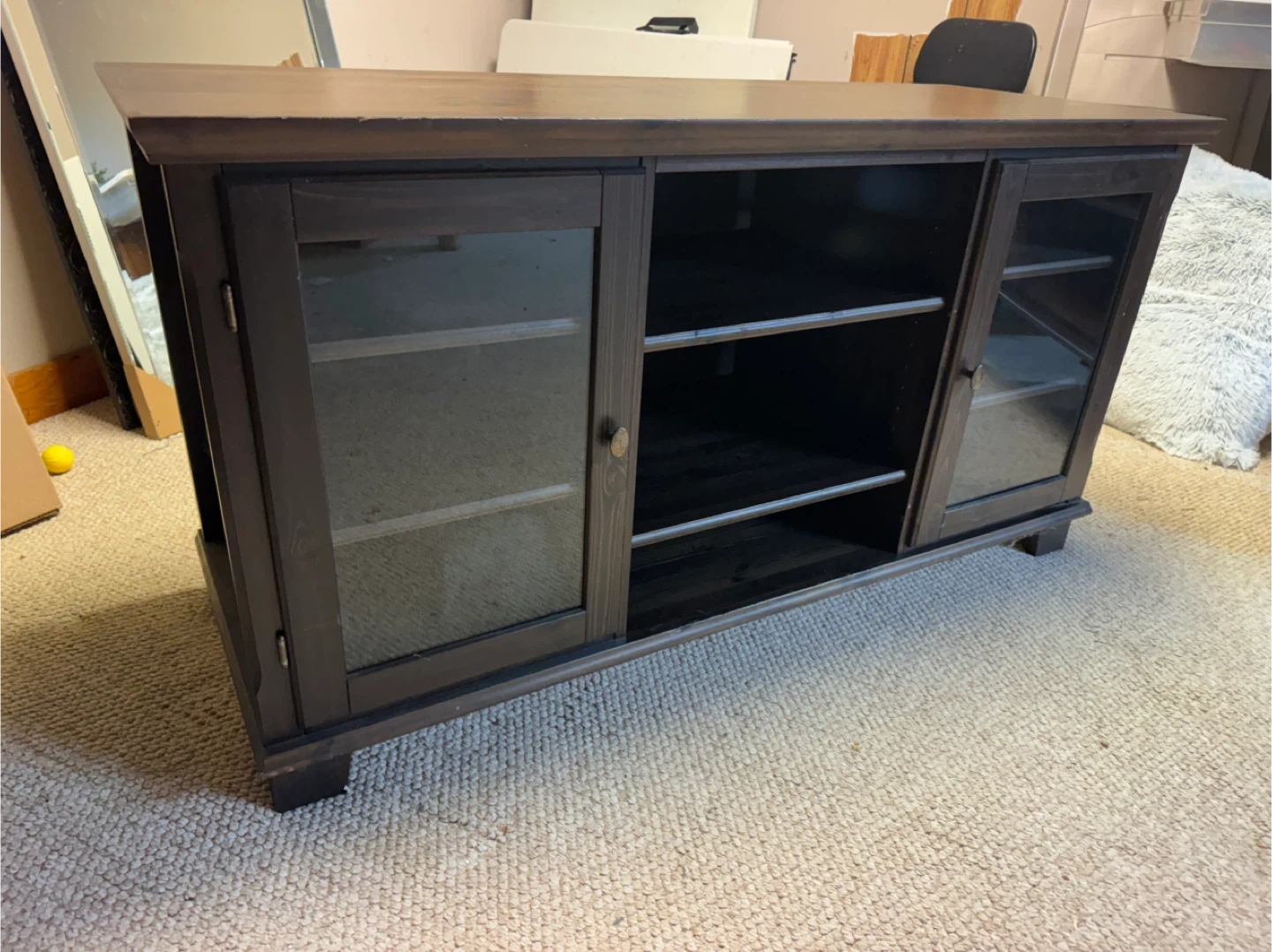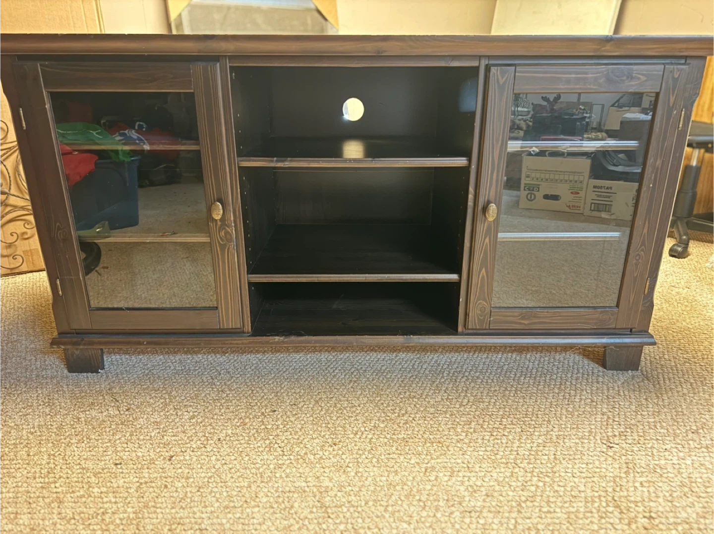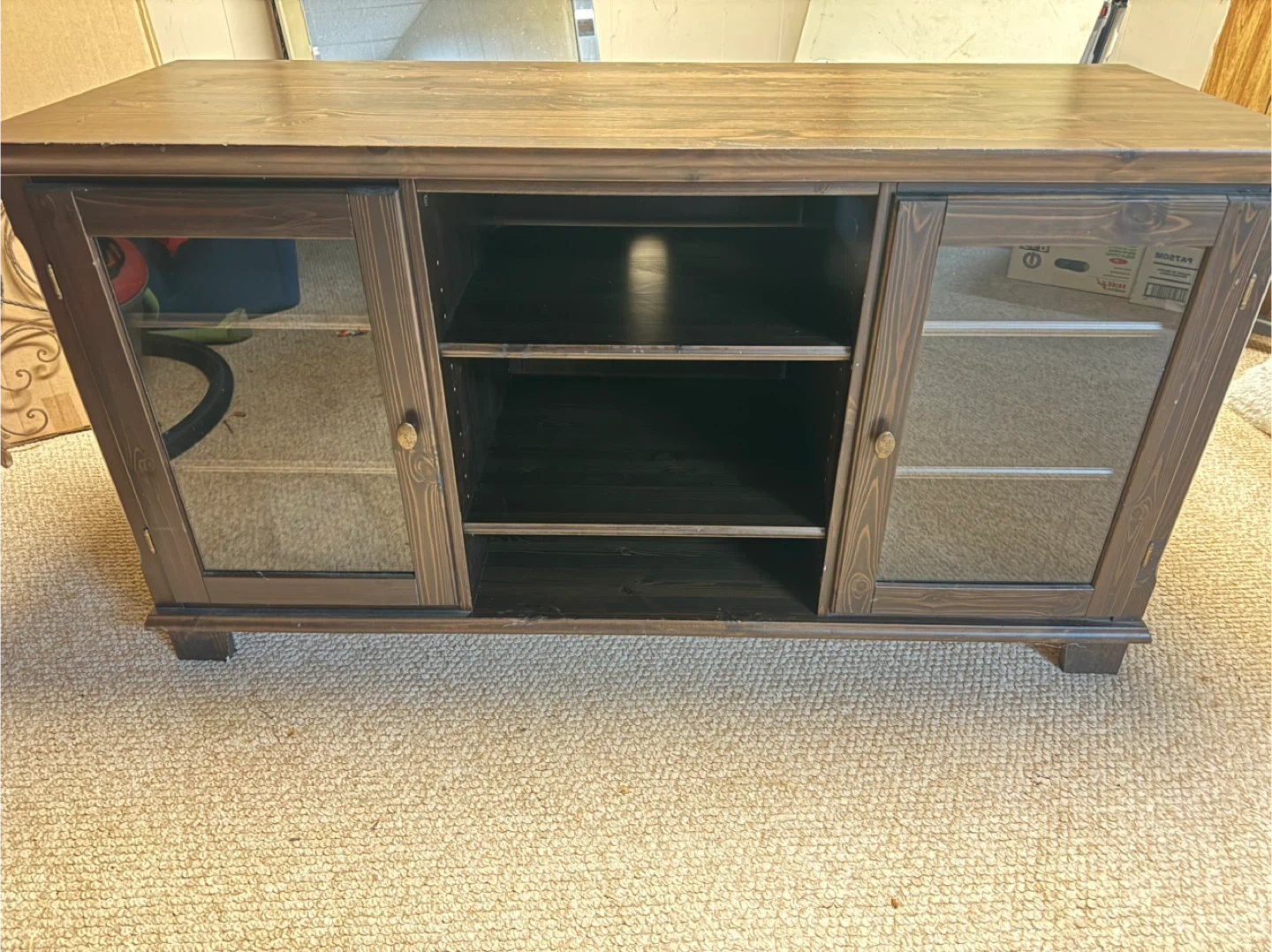 Selling a dark brown wood TV stand. It features glass doors on either side and open shelving in the middle. A great tv stand with lots of extra room for living room items. Measures 54 1/4” long x 20 1/2” wide x 28 1/2”height. This unit is very sturdy also.
