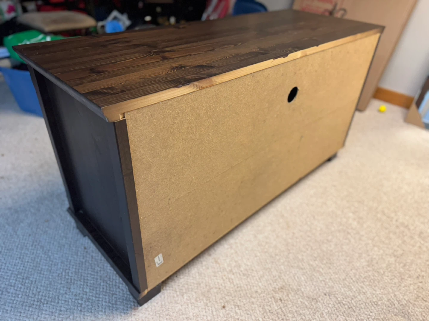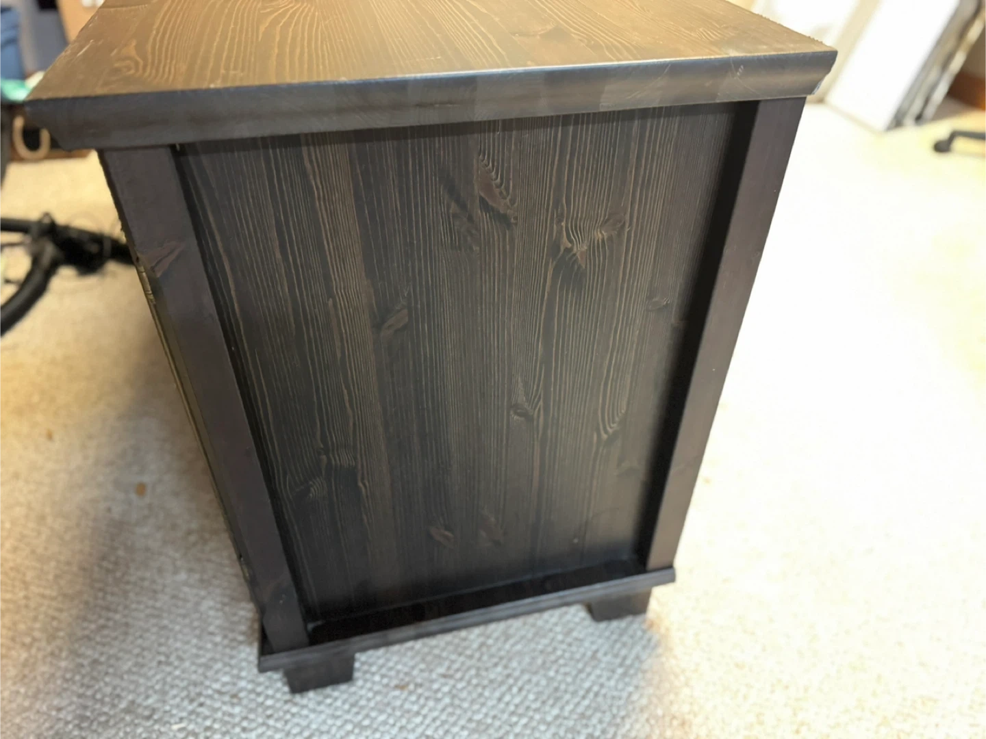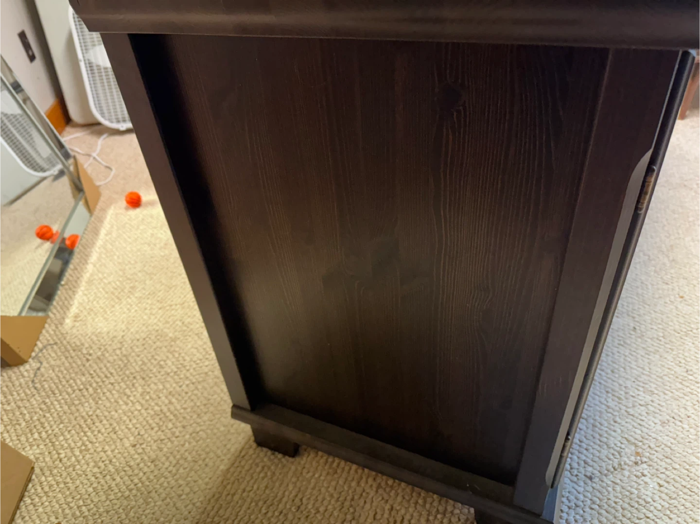 Selling a dark brown wood TV stand. It features glass doors on either side and open shelving in the middle. A great tv stand with lots of extra room for living room items. Measures 54 1/4” long x 20 1/2” wide x 28 1/2”height. This unit is very sturdy also.