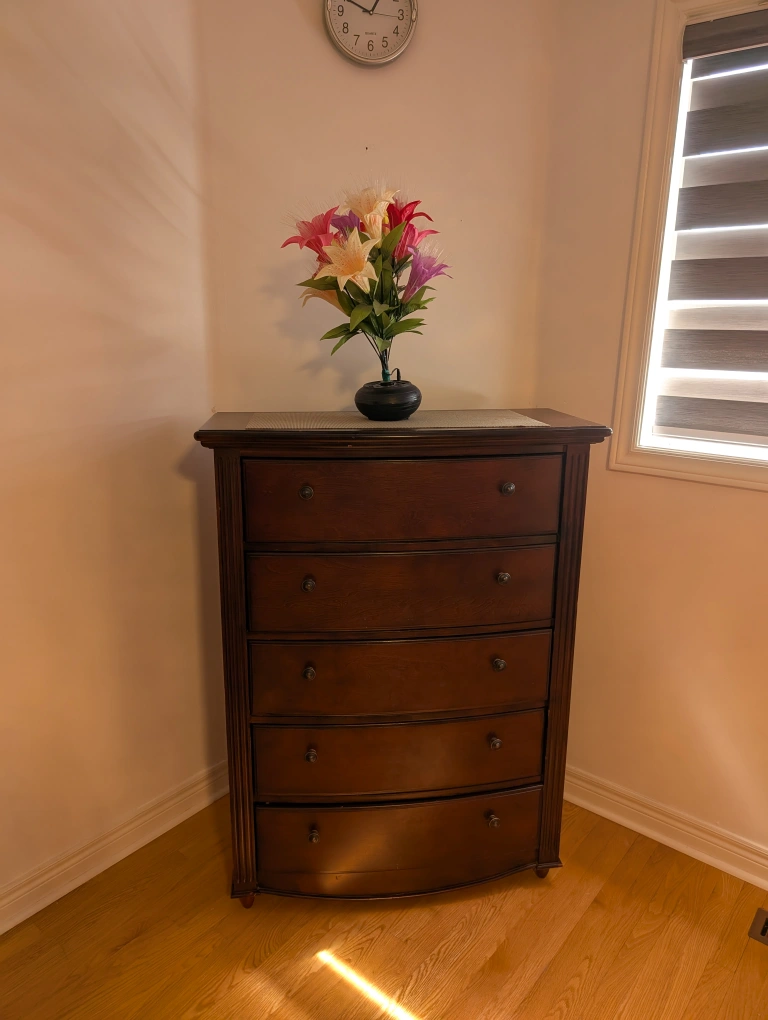 Five-drawer dresser. Dark brown wood finish. Curved front. Elegant style. Good condition.