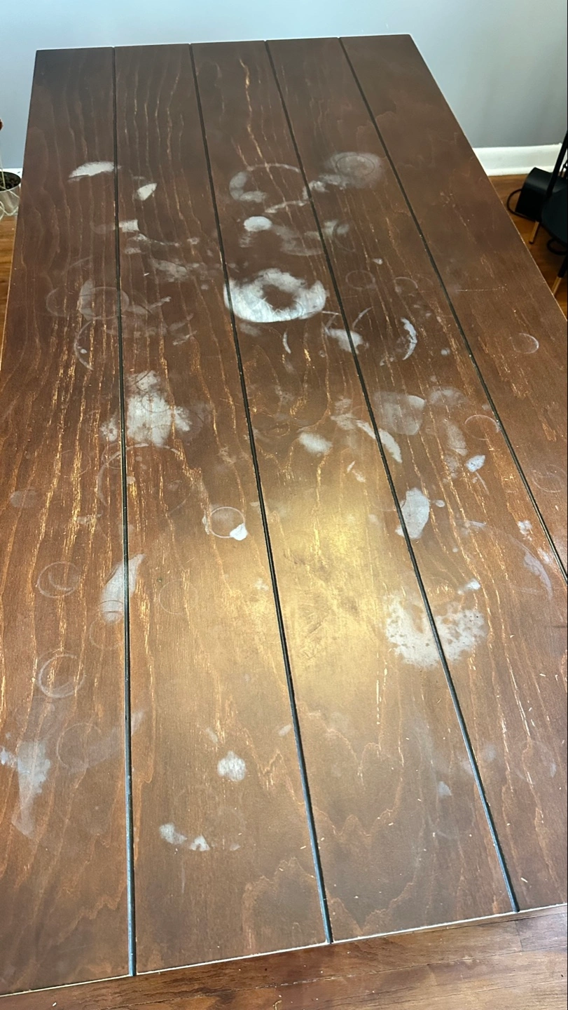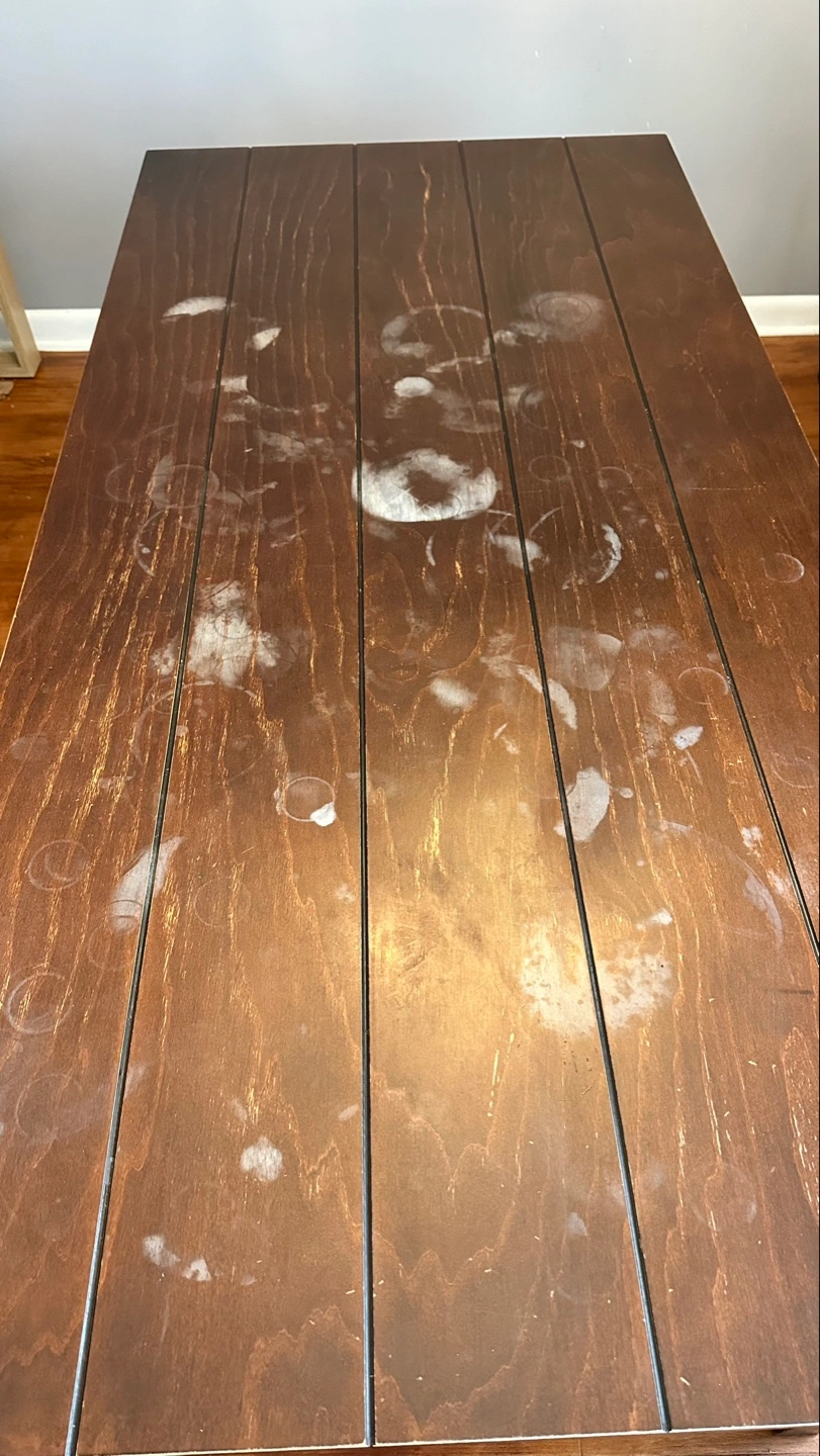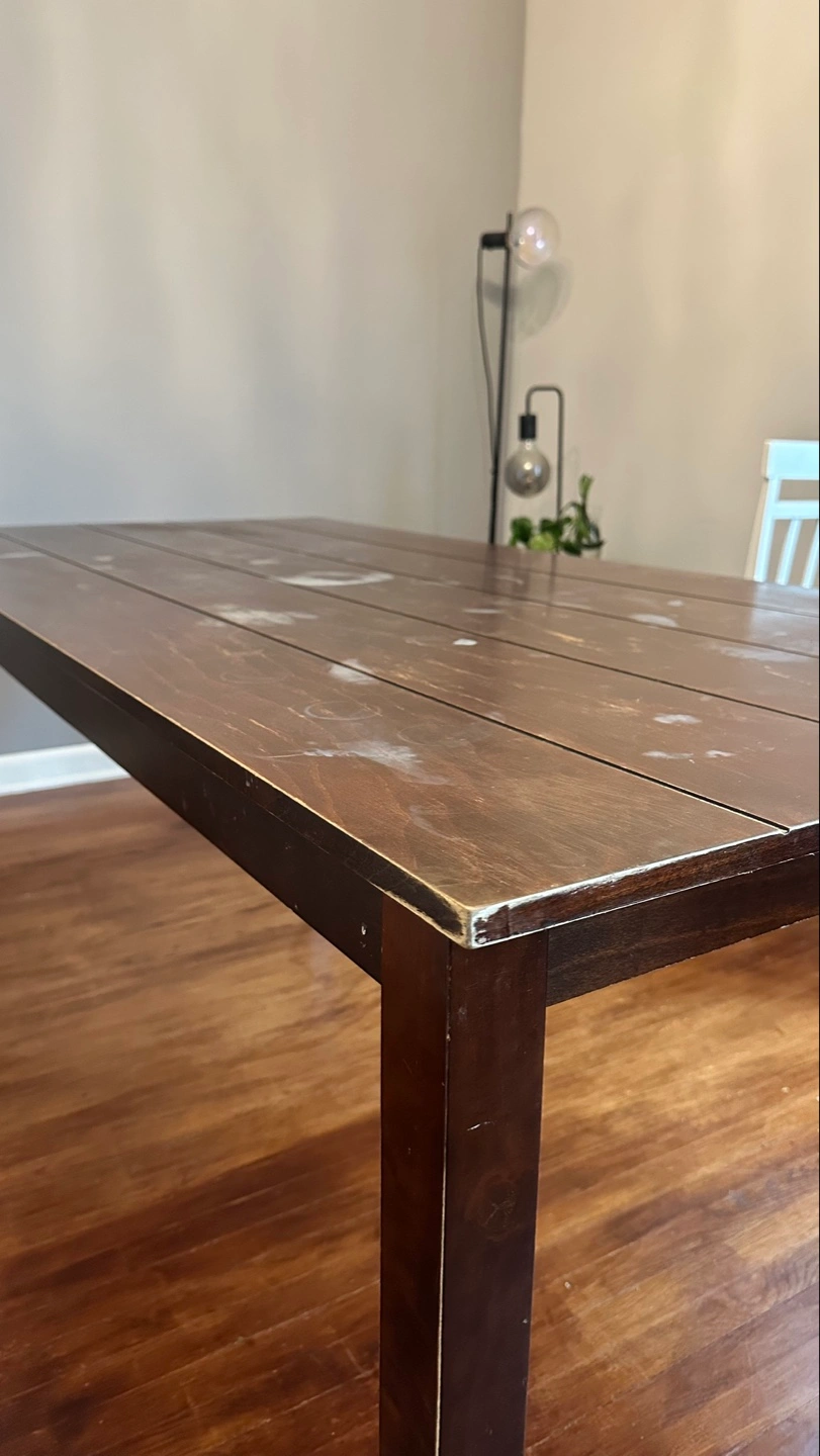 27Rectangular dining table. Dark brown wood. Shows some wear and tear. Seats six to eight comfortably. I couldn’t finish working on it, it’s just a bit sanded. Use it with table cloth or refinish.