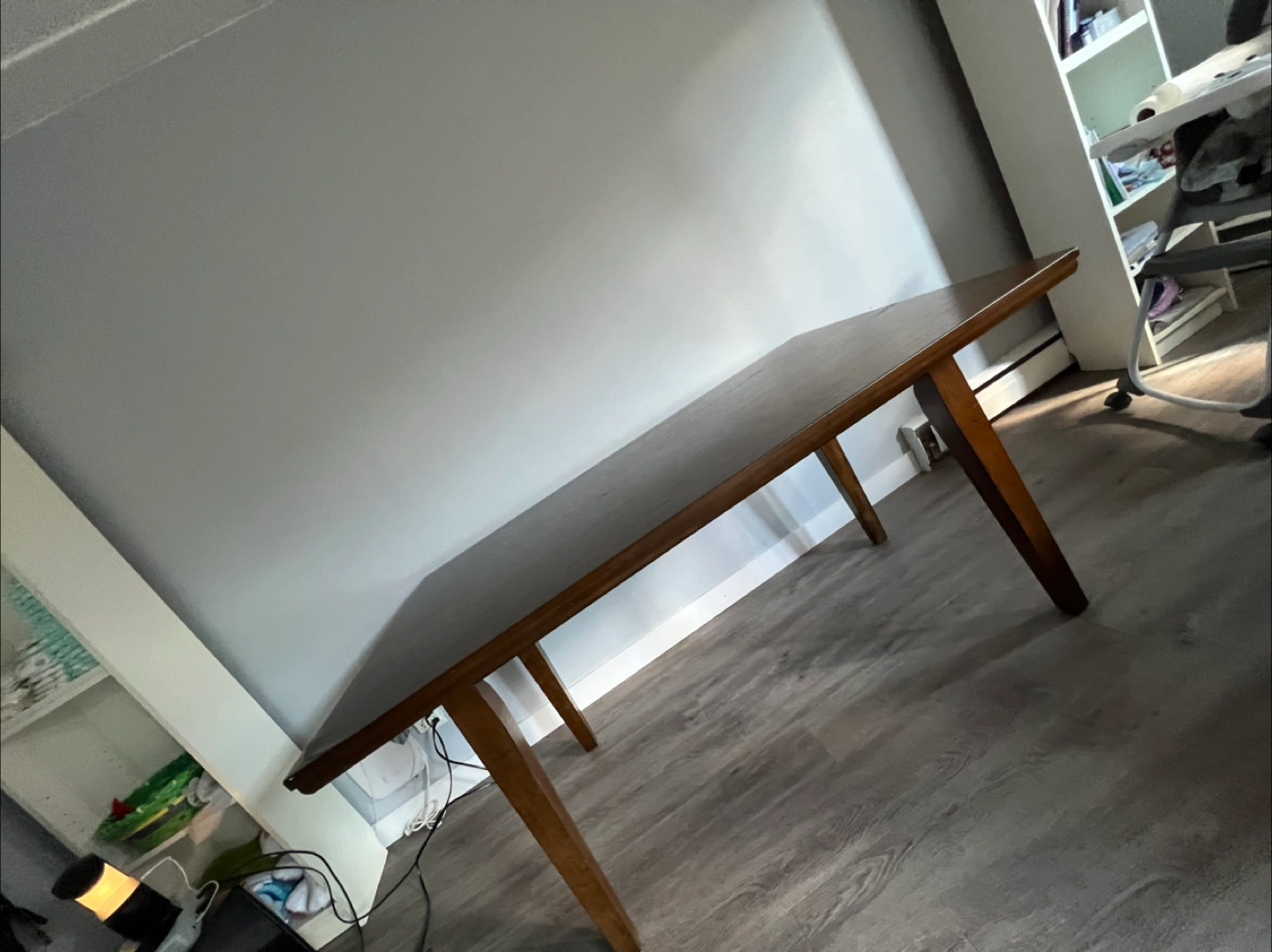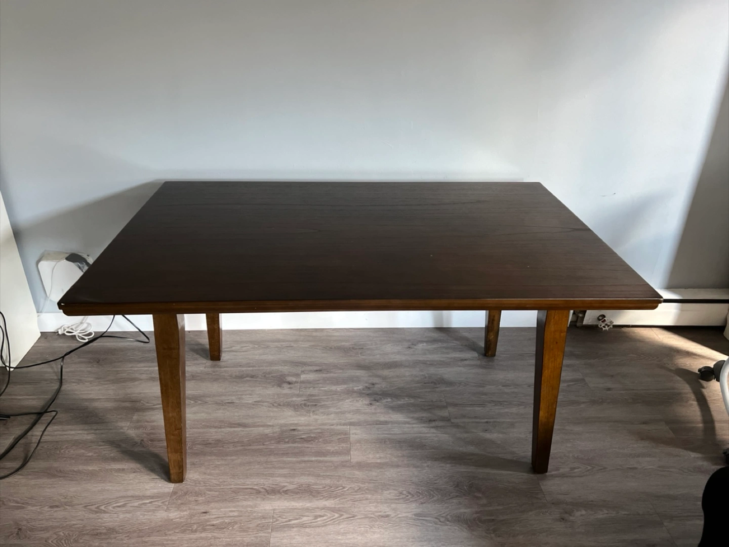 Selling a sturdy dark brown wooden dining table. It's in good condition and perfect for a small dining area or kitchen. It has a square shape and simple design that would fit well with most decor styles. It's a great table for everyday use, comes with 4 free chairs they’re take them or leave them.