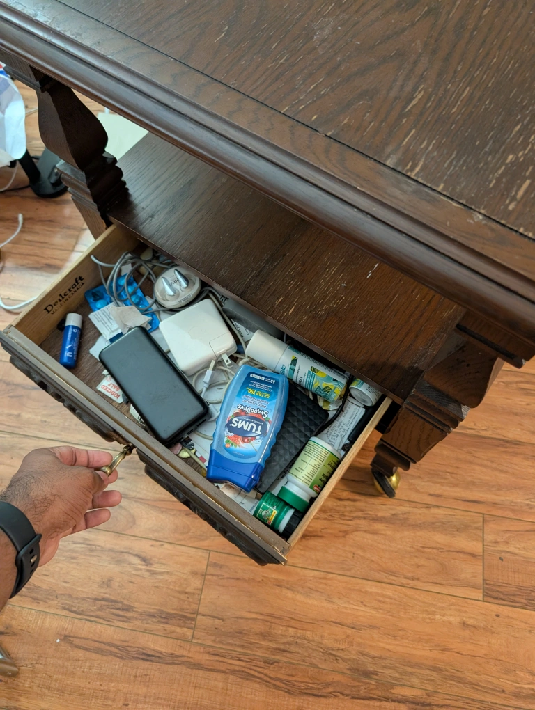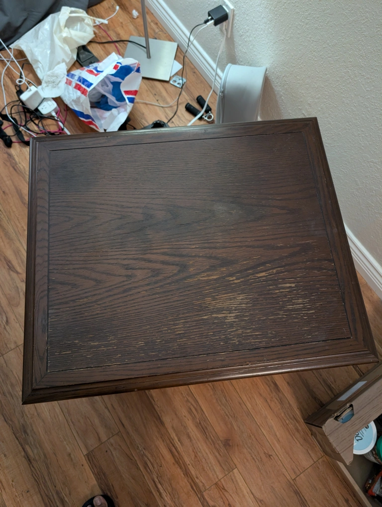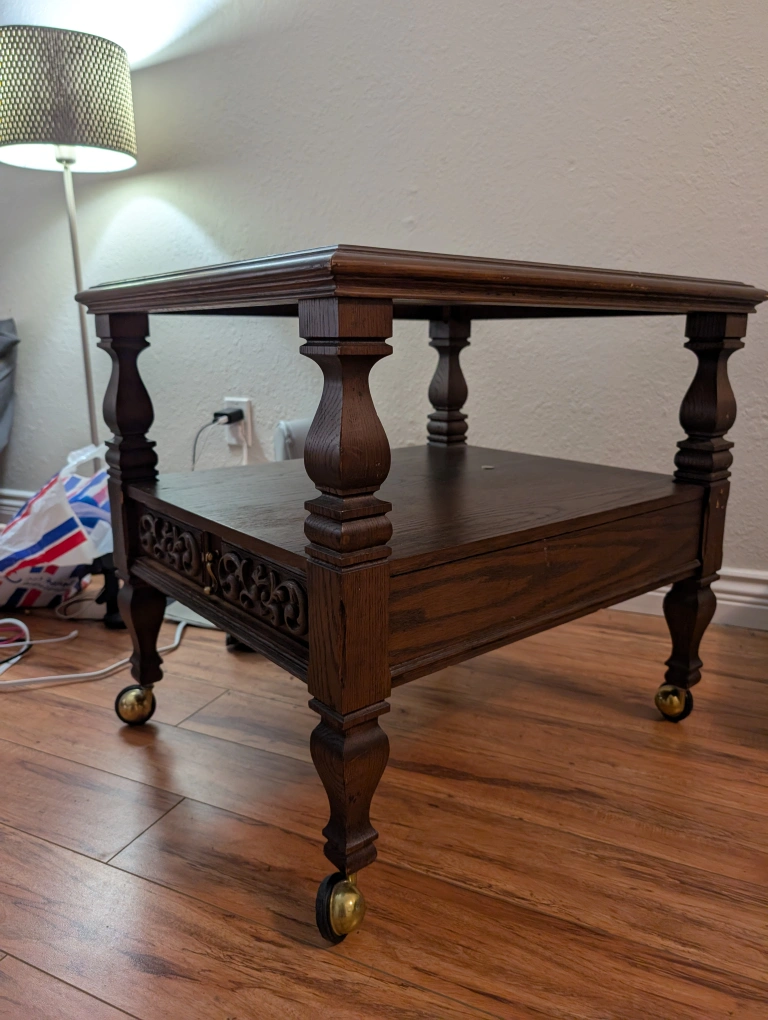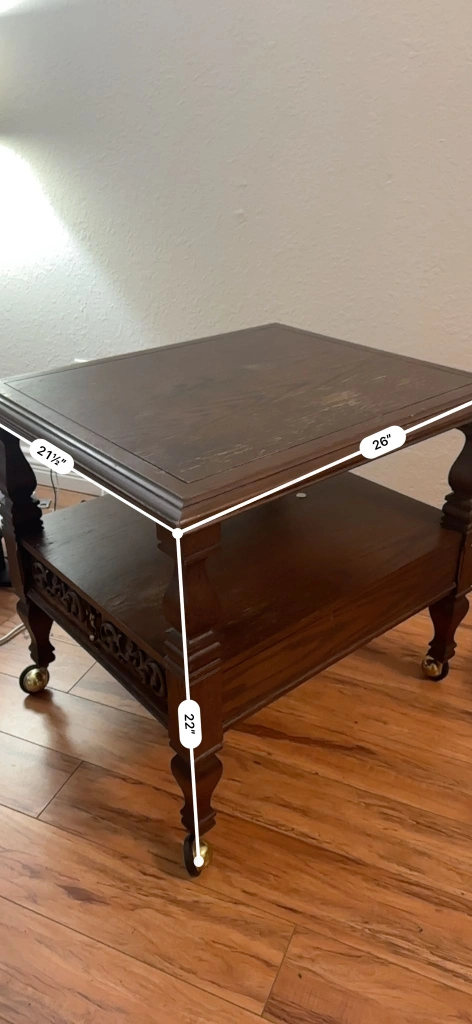 Selling a dark brown wooden end table. It features a drawer for storage and has a lower shelf as well. The table is on casters, making it easy to move around. can be used as nightstand of in living room. Dimensions: - Height: 22" - Width: 26" - Depth: 21.5"
