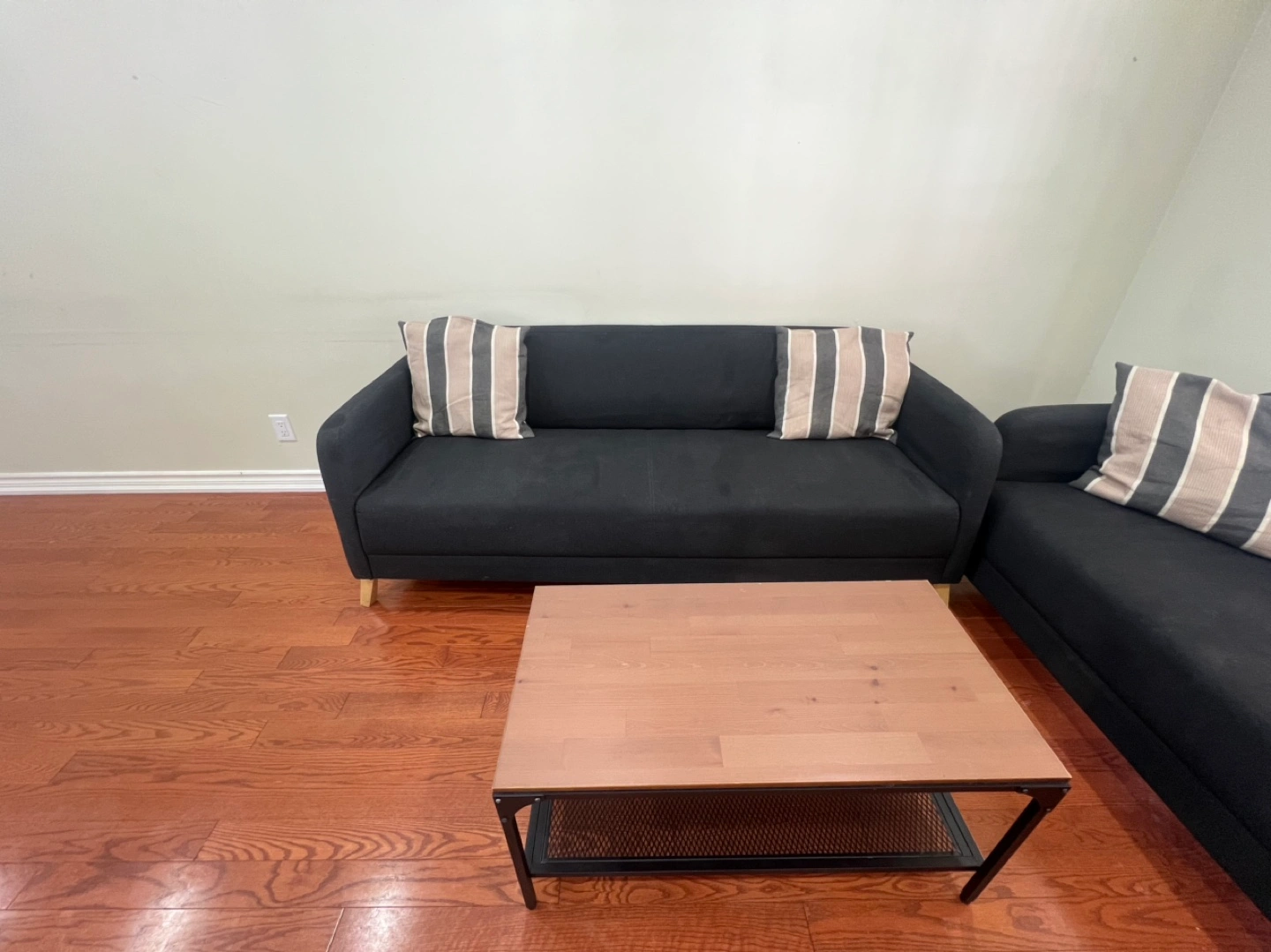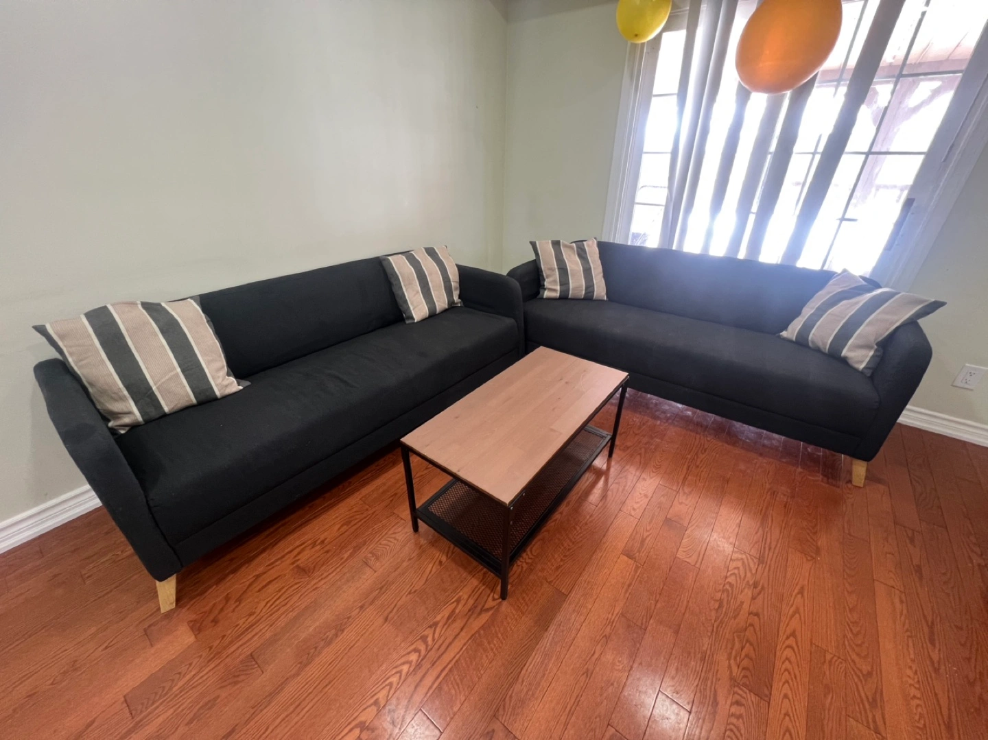 13Modern sectional sofa, dark grey fabric. Includes coffee table with light wood top and black metal frame. Two matching throw pillows included. 4377579028 for any inquiries . Pick up at 37 hun crescent Etobicoke