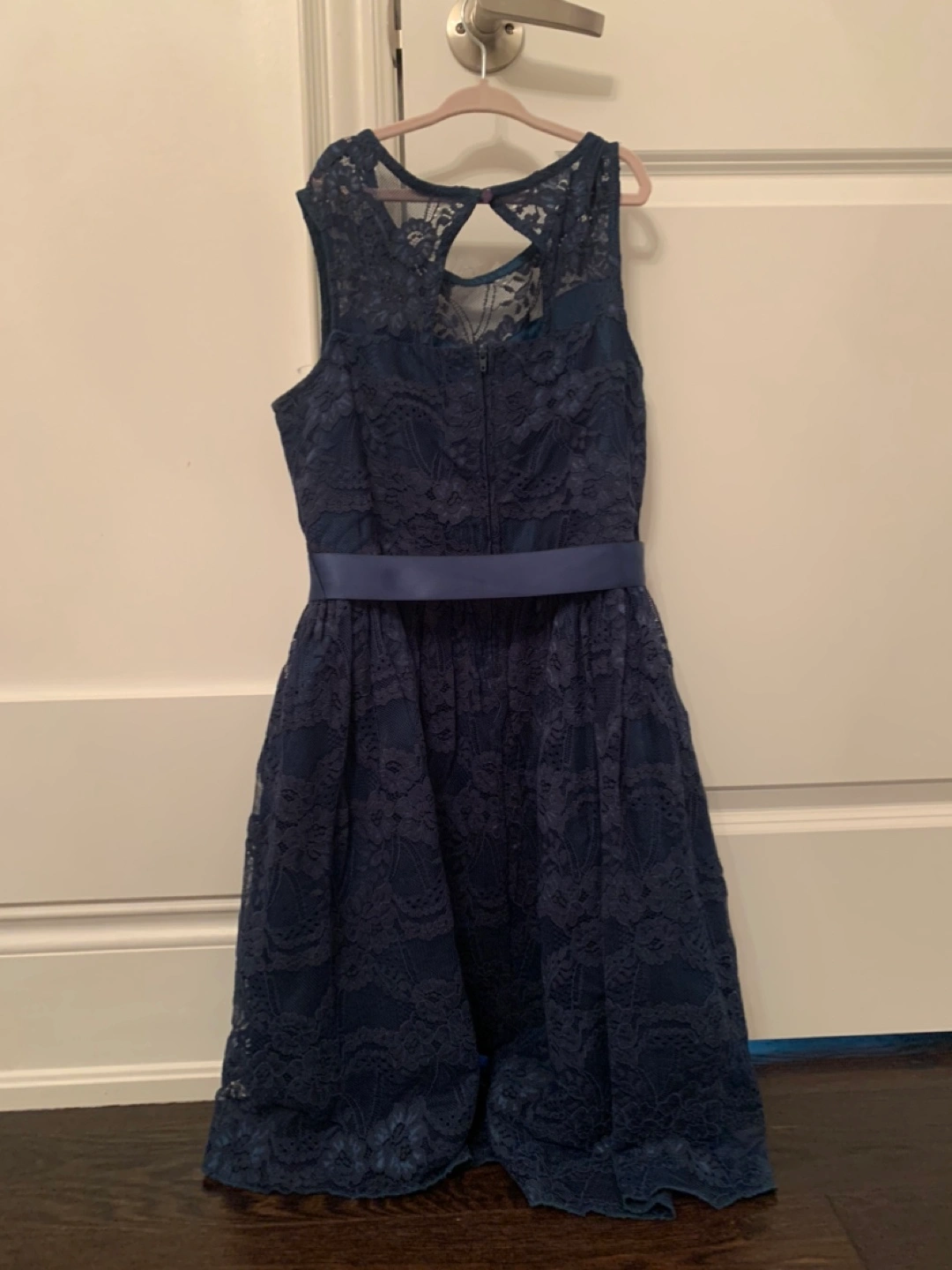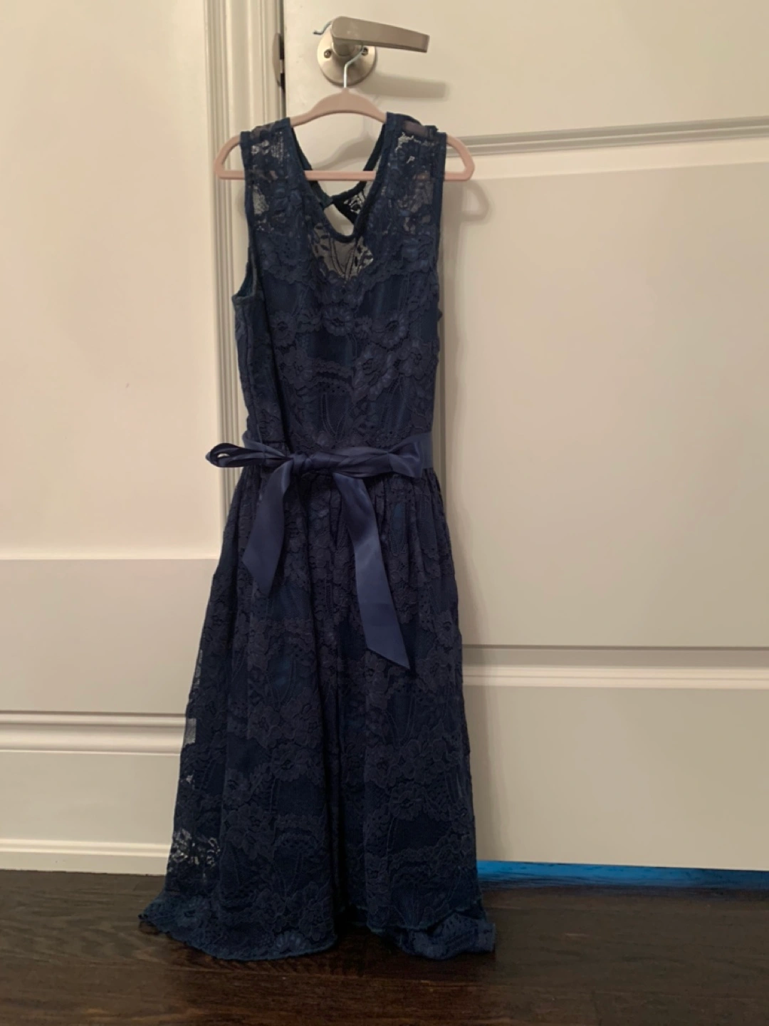 Selling a beautiful dark turquoise lace dress. It's in great condition and features a lovely lace overlay with a ribbon sash. Perfect for a special occasion or a night out! Size 14 youth.