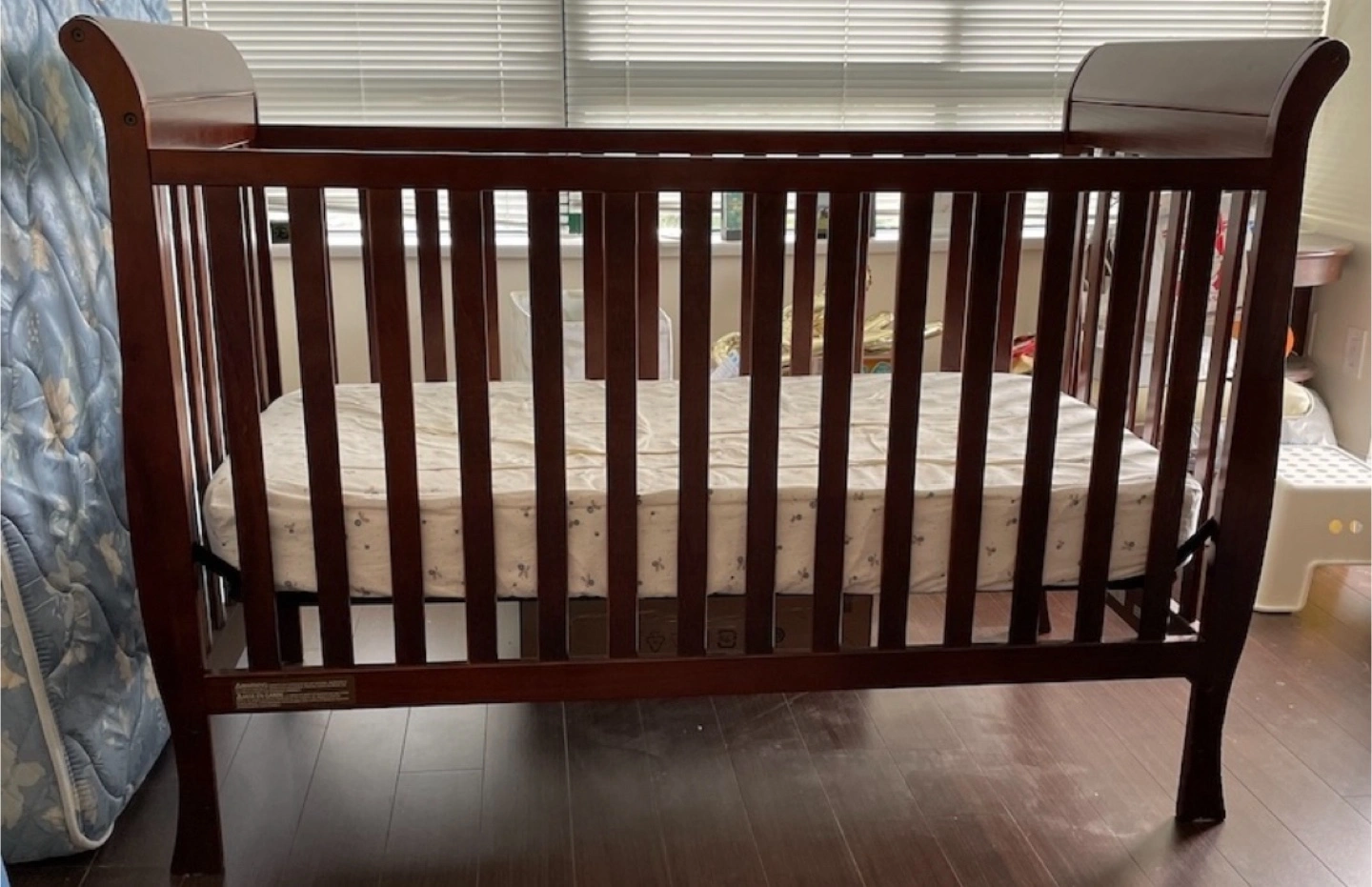 10Selling a dark wood baby crib. It's in good condition and ready for a new home. Perfect for your little one's nursery! measured in inches: 55.75 (long) by 32.25 (wide) by 41.75 (height) Fits mattress measuring 28”x52”. You can read a very similar product description here. https://deltaplayground.myshopify.com/products/parkside-3-in-1-crib-cabernet Ours does not have the daybed rail.