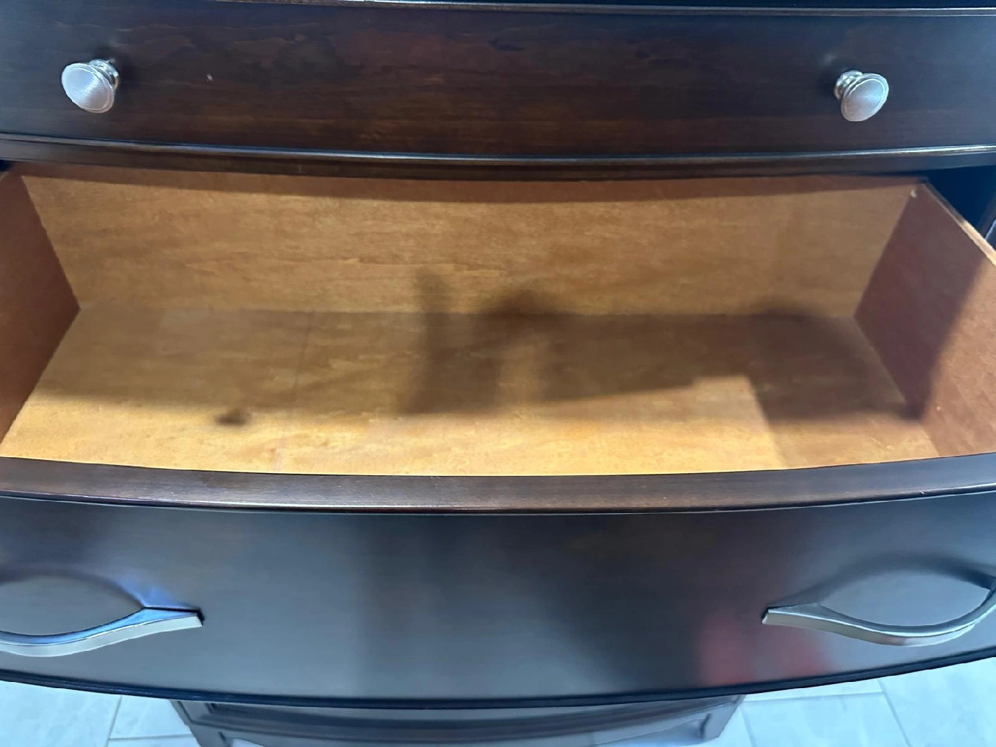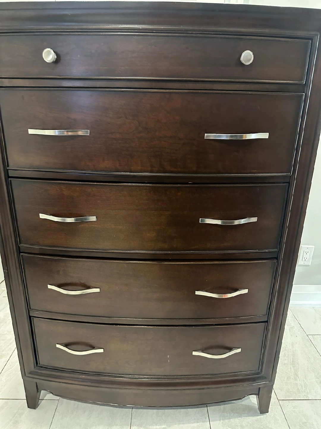 Selling a lovely dark wood chest of drawers! It features five spacious drawers with silver-tone handles. Perfect for adding some classic style to your bedroom or living space. It's in great shape and ready for a new home!